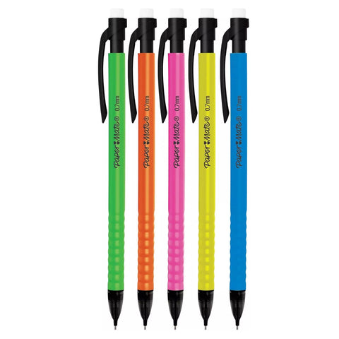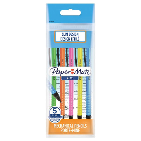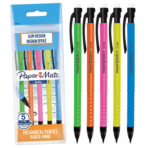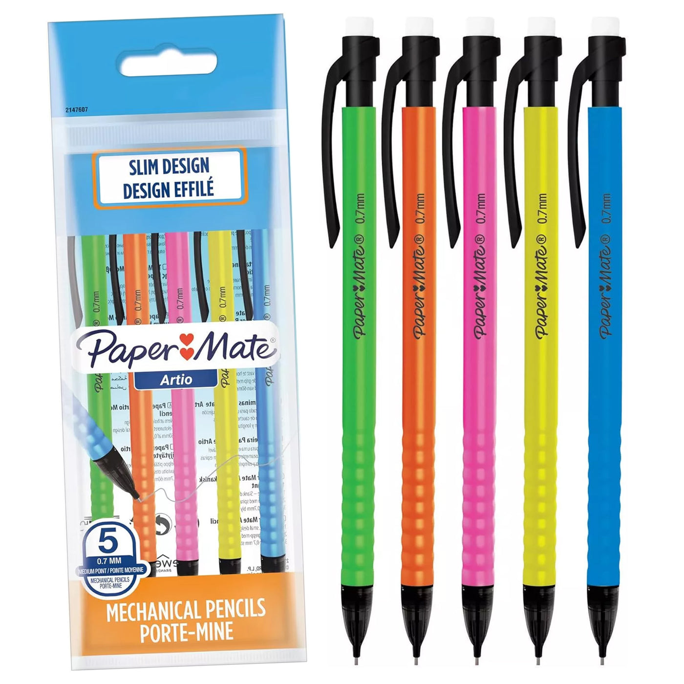 The Paper Mate Artio Mechanical Pencils offer a slim, lightweight design with a textured grip for comfortable writing. Each pencil is equipped with 0.7mm HB #2 lead, making them suitable for standard writing tasks. The pack includes five pencils in assorted vibrant colors, adding a touch of fun to your stationery collection. These pencils are ideal for students and professionals seeking reliable and colorful writing instruments.