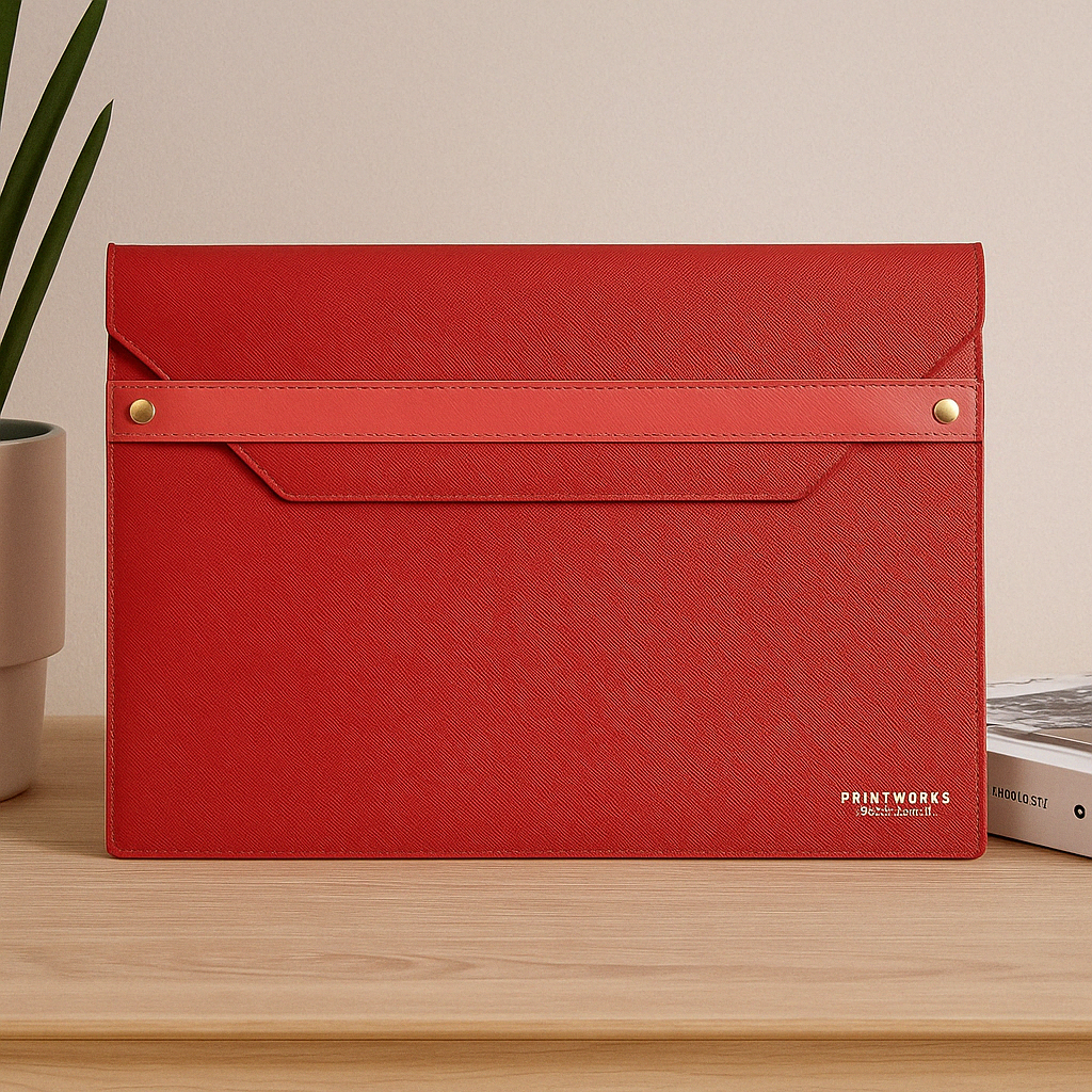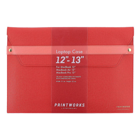 Protect your tech in style with this sleek red faux leather laptop sleeve by PRINTWORKS Stockholm. Designed to fit 12–13" laptops including MacBook Air, MacBook Pro, and tablets up to 31cm x 22cm. Featuring gold-tone button closures and a minimalist Scandinavian design, it's the perfect blend of fashion and function for work or travel.