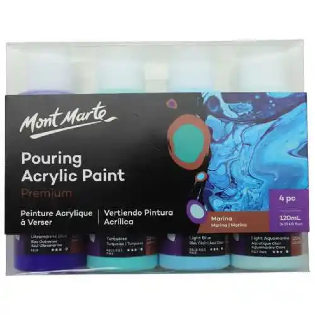 Unleash your creativity with the Mont Marte Pouring Acrylic Paint Set – 4pc Marina Collection! This set features 4 vibrant, high-quality pouring paints, specifically designed for fluid art techniques like pouring, swirling, and marbling.