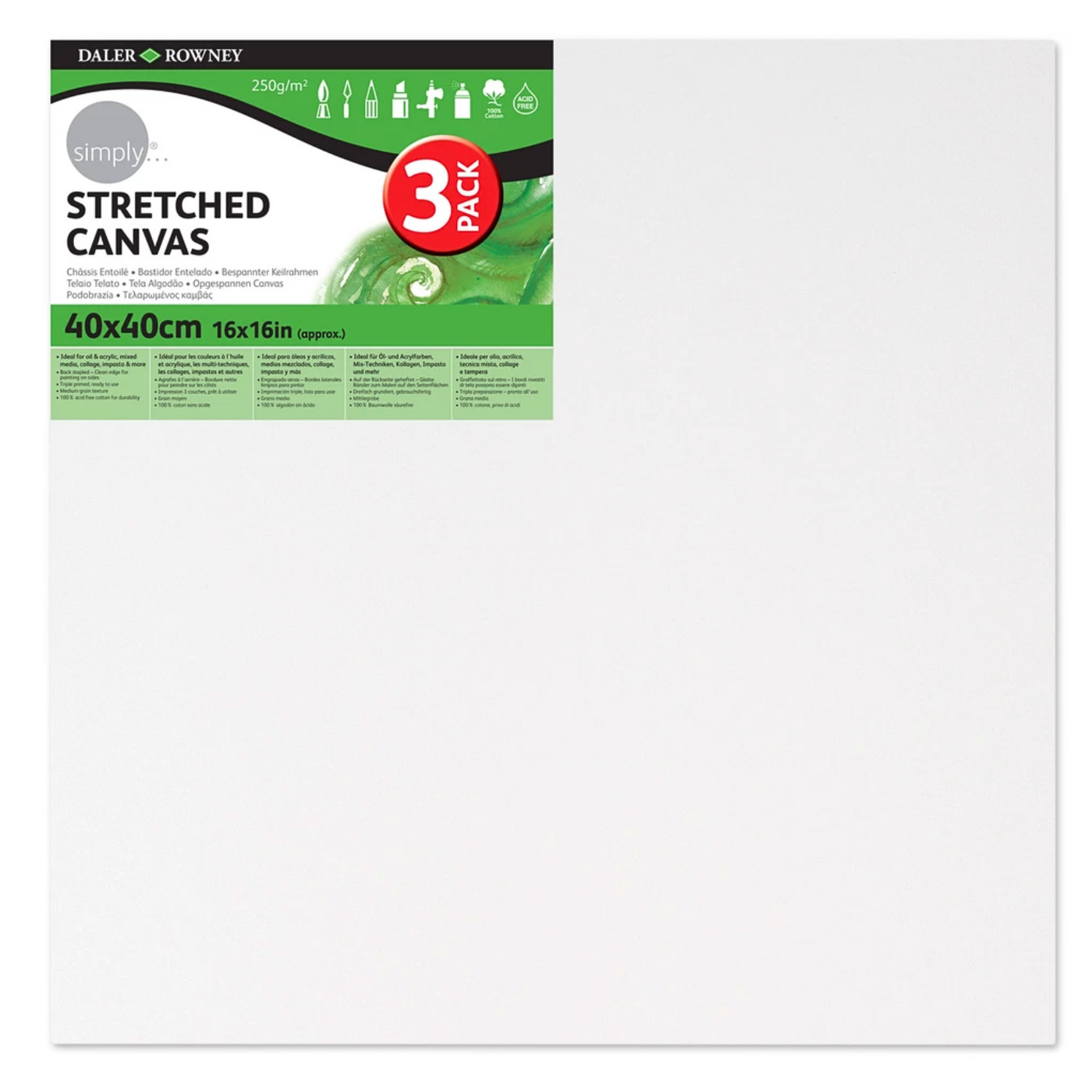 Unleash your creativity with the Simply Canvas 3 Pack (40x40cm / 16x16). Perfect for acrylics, oils, and mixed media, these durable, pre-stretched canvases are primed and ready to use. Ideal for artists, hobbyists, and DIY décor projects, they provide a smooth surface for bold artwork and lasting results.