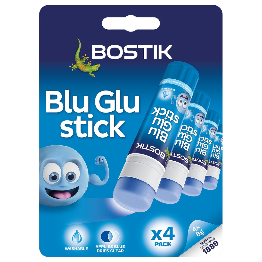 Make sticking simple with Bostik 4pk 8g Blu Glue Stick Carded, a handy set of smooth, mess-free glue sticks ideal for home, school, or office use. The vibrant blue glue goes on colored and dries clear, helping ensure precise application every time. Perfect for paper, card, and light craft projects, these fast-drying, solvent-free sticks are safe for children and provide strong, long-lasting adhesion.