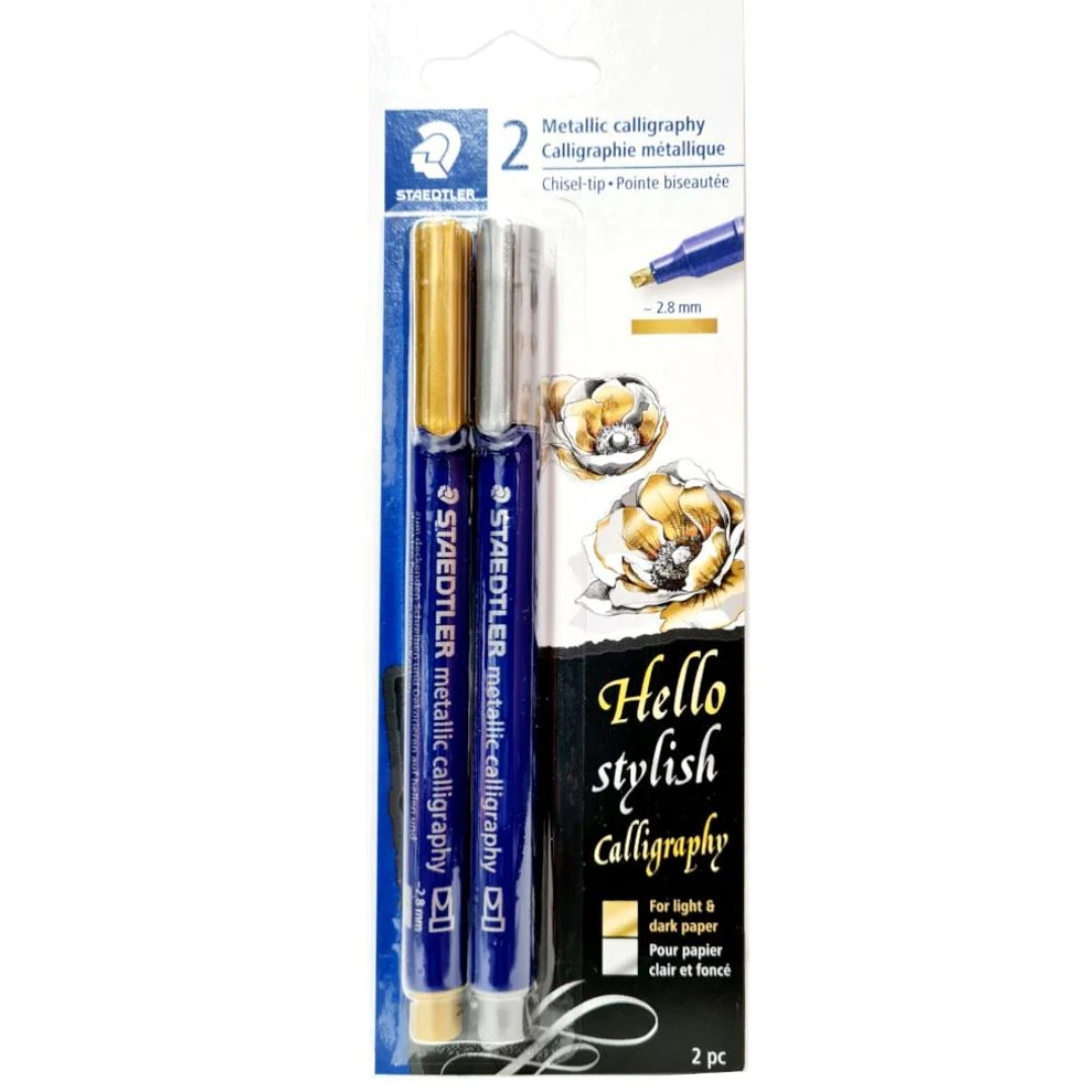 Add a shimmering touch to your writing with the Staedtler 2PK Metallic Calligraphy Markers, perfect for cards, crafts, and decorative lettering. Each pen features a chisel tip that creates clean, elegant strokes with a 2.8 mm line width. The metallic gold and silver inks provide bold, opaque coverage on both light and dark surfaces. No shaking or pumping required—just uncap and write with smooth, consistent flow. Ideal for paper, card, or even non-porous surfaces like glass and plastic. Quick-drying and low-odour, these markers are both practical and stylish. A great choice for creatives, crafters, and calligraphy lovers.