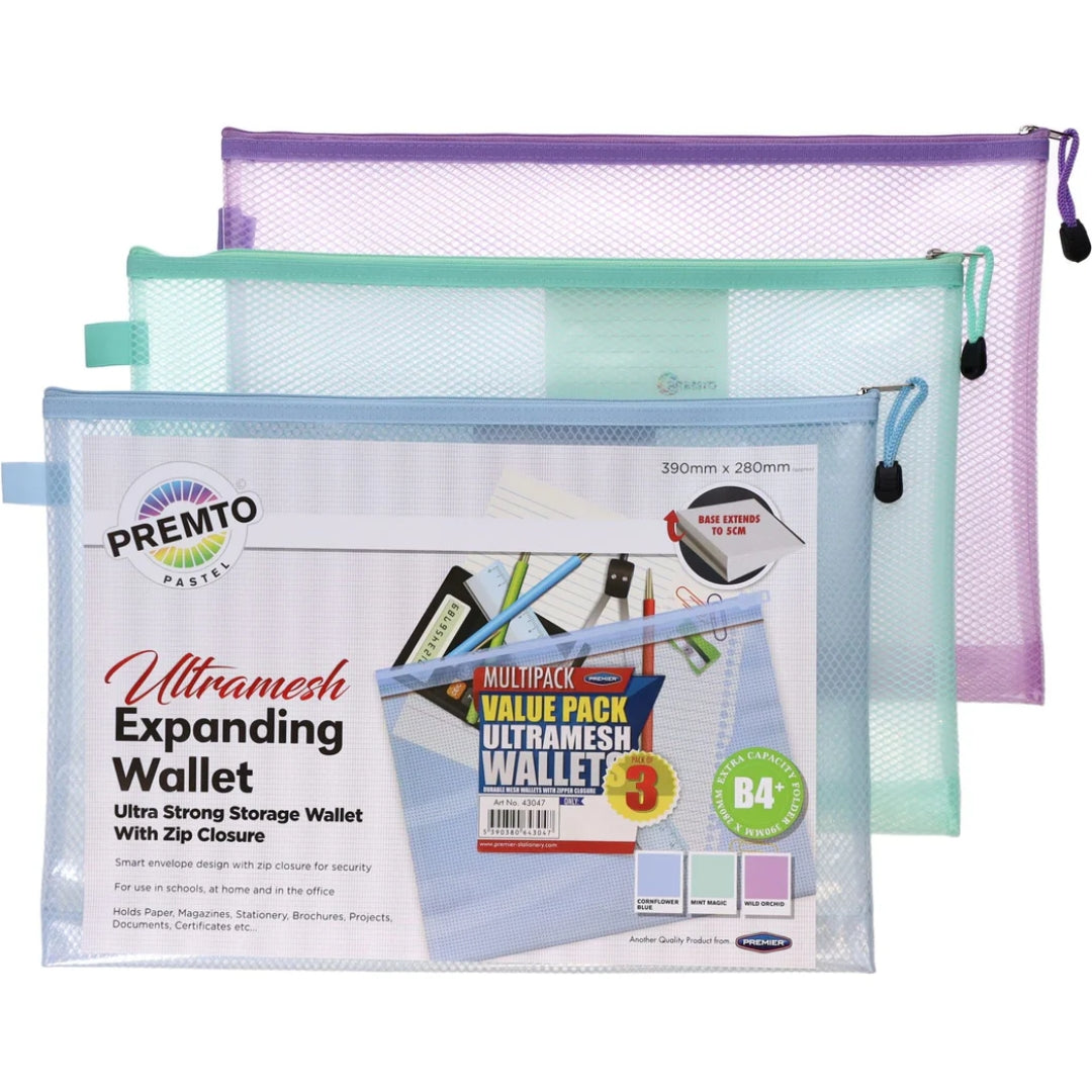 Organise and protect your documents in style with the Pastel 3-Pack Mesh Expandable Wallets, designed for both practicality and aesthetic appeal. Made from durable mesh material, these wallets expand to accommodate larger files, notebooks, or accessories while allowing you to see the contents at a glance. The secure zip closure keeps everything in place, and the soft pastel shades make organisation easy and visually appealing. Perfect for school, office, or home use, the Mesh Expandable Wallets combine functionality with a fresh, modern look.
