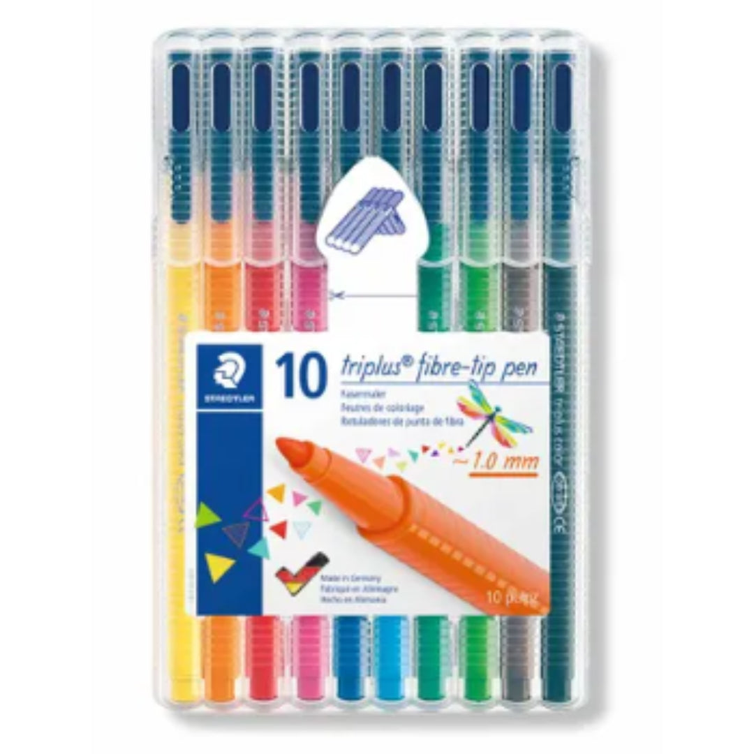 Bring colour and precision to your projects with the Staedtler Triplus Fibre Tip Pens 10-Pack. Featuring an ergonomic triangular barrel for a relaxed grip, these pens offer vibrant, water-based ink that washes out of most fabrics. The fine 0.3 mm tip delivers smooth, consistent lines—perfect for writing, colouring, drawing, and detailed design work. The assorted colour selection makes them ideal for school, office, or creative use, while the DRY SAFE technology means they can be left uncapped for days without drying out. Durable, comfortable, and easy to use for hours of creative fun.