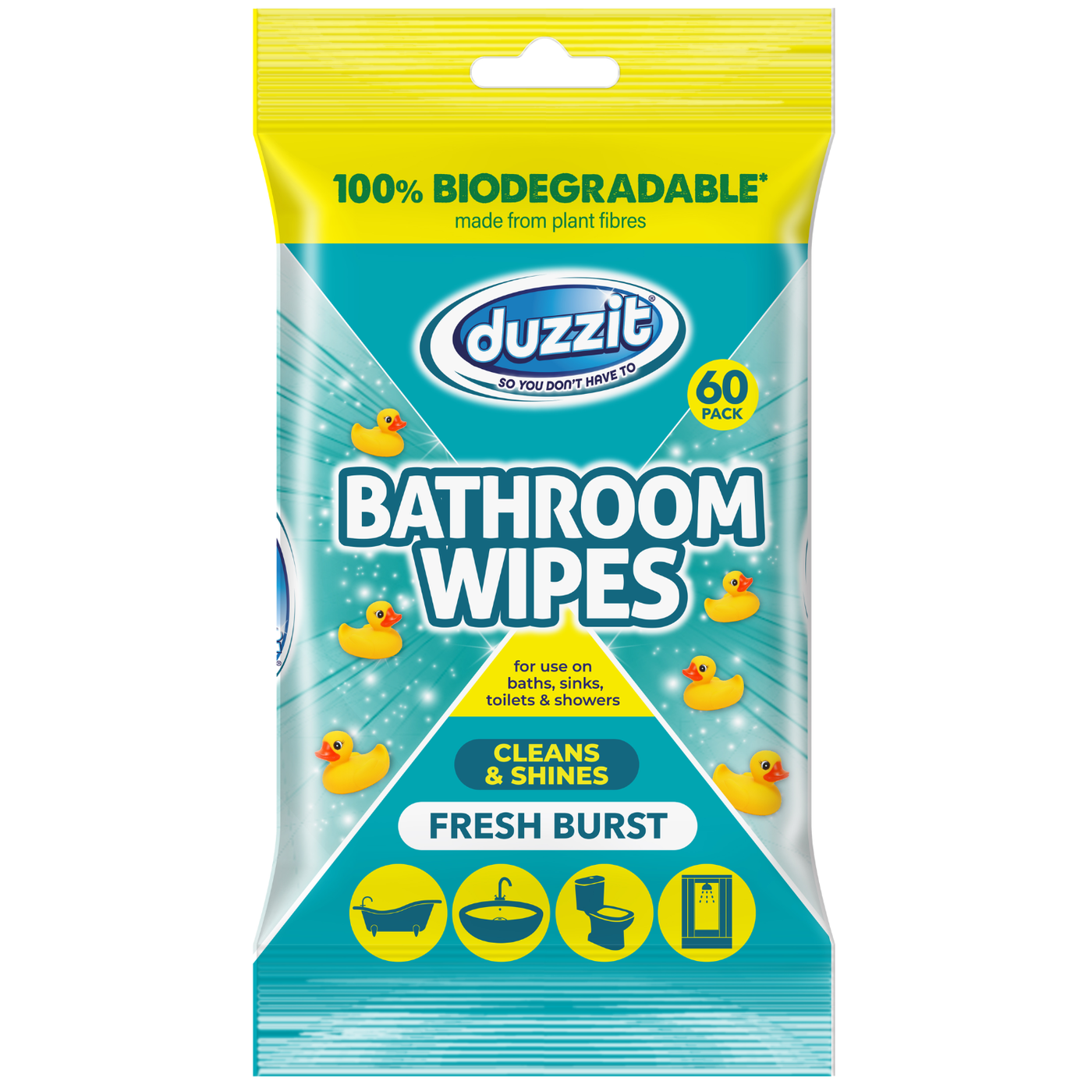 Keep your bathroom clean and hygienic with Duzzit Biodegradable Bathroom Wipes Fresh Burst (60 Pack). Designed to tackle soap scum, limescale, and everyday grime, these strong, pre-moistened wipes are perfect for sinks, taps, tiles, toilets, and shower surfaces. With a refreshing Fresh Burst fragrance, they leave surfaces sparkling and deodorised. Made from biodegradable material, they offer a convenient and eco-friendly cleaning solution for busy homes.