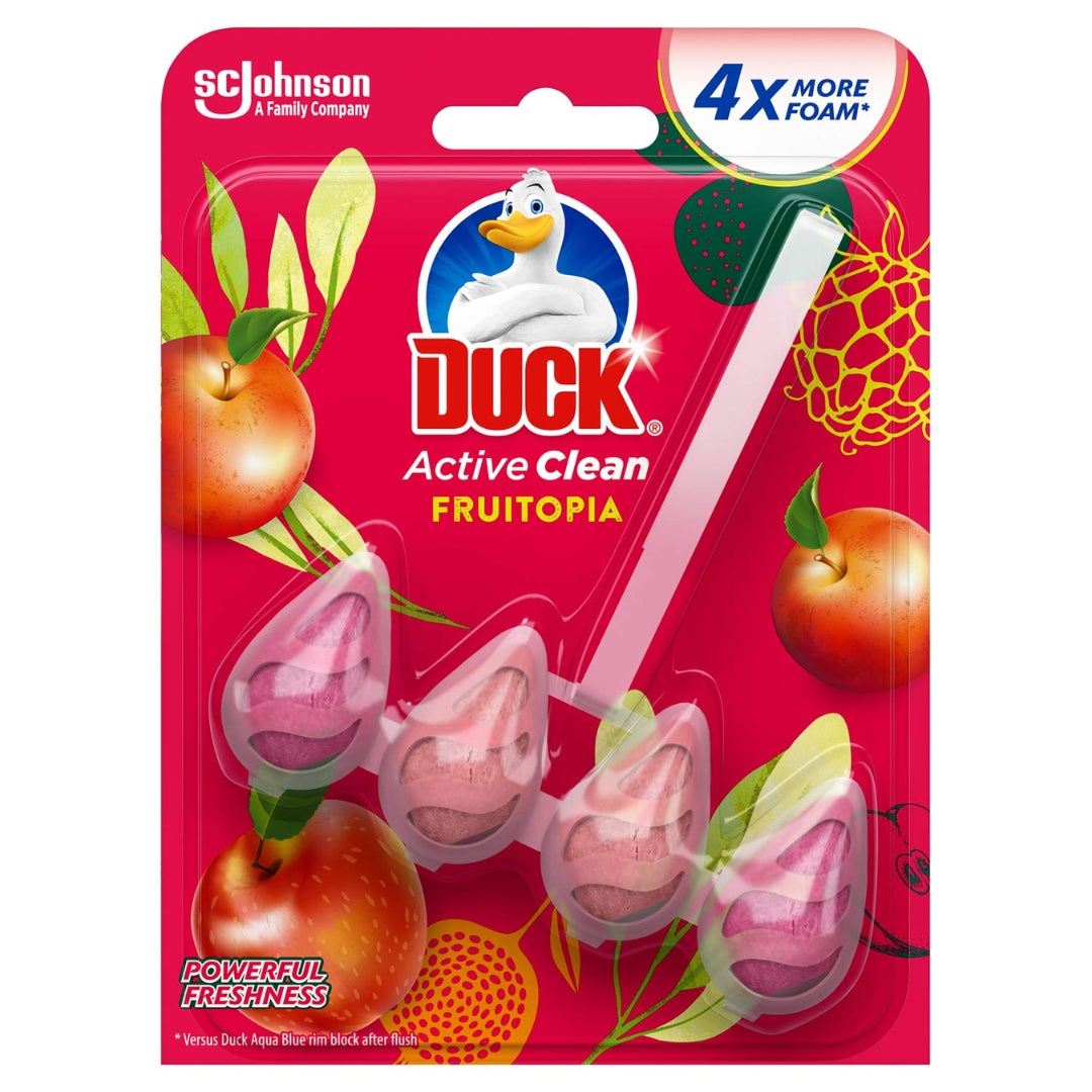 Keep your toilet fresh and clean with Toilet Duck Rim Block Fruity. Designed to attach easily to the rim of your toilet bowl, this rim block releases a fruity fragrance with every flush while helping to prevent limescale build-up and maintain cleanliness. Its powerful formula ensures a fresh scent and a sparkling bowl between cleans, making it a convenient and effective addition to your bathroom routine.