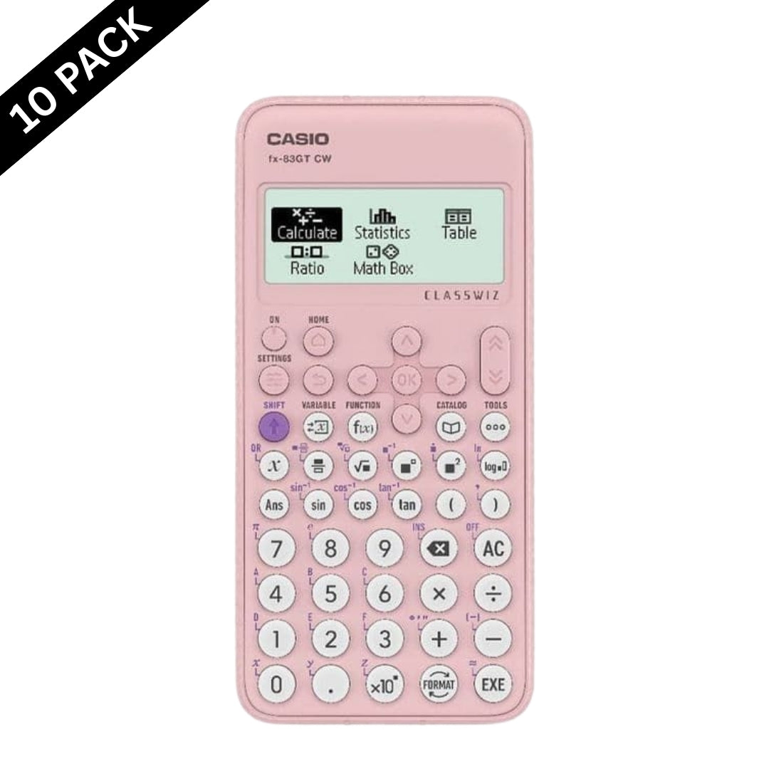 This box of 10 Casio FX-83GTCW Pink Scientific Calculators features 290+ functions including fractions, trigonometry, and statistics—ideal for secondary school maths and science. Lightweight and exam-approved, these battery-powered calculators combine style with performance. A perfect bulk buy for classrooms, study groups, or schools looking for dependable, student-friendly scientific calculators in a vibrant pink finish.