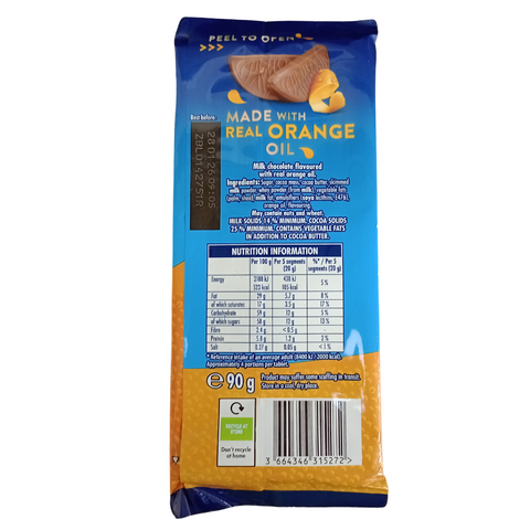 Sugar, Cocoa Mass, Cocoa Butter, Skimmed Milk Powder, Whey Powder (from Milk), Vegetable Fats (Palm, Shea), Milk Fat, Emulsifiers (Soya Lecithins, E476), Orange Oil, Flavouring, Milk Solids 14 % minimum. Cocoa Solids 25 % minimum, Contains Vegetable Fats in addition to Cocoa Butter