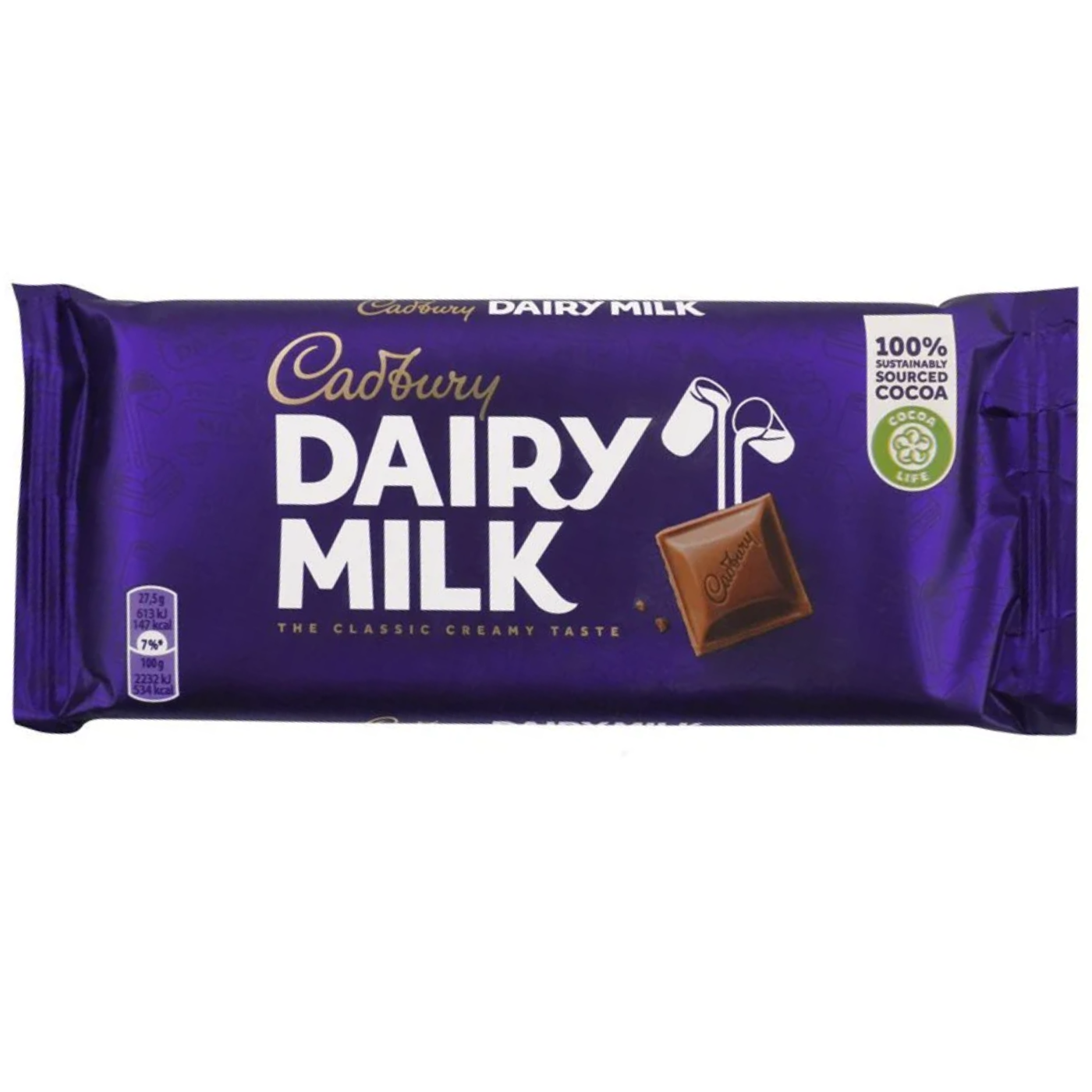 Indulge in the timeless taste of Cadbury Dairy Milk 110g, made with fresh milk and rich cocoa solids for that unmistakably smooth and creamy flavour. This classic chocolate bar is perfect for sharing, gifting, or enjoying piece by piece. Whether for a cosy night in or a sweet afternoon treat, Cadbury Dairy Milk delivers pure chocolate happiness in every bite.