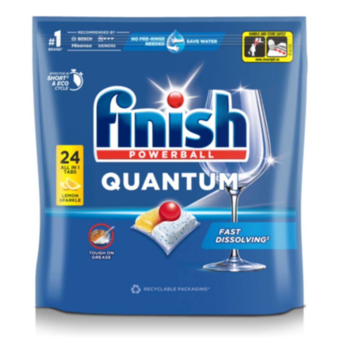 Achieve a sparkling clean with Finish Quantum Lemon Tabs 24s, powerful dishwasher tablets designed to tackle tough stains, grease, and dried-on food. With a refreshing lemon scent, these tabs provide deep cleaning action, shine protection for glassware, and effective grease-cutting power, ensuring spotless results with every wash. Conveniently pre-measured, they’re easy to use and deliver professional-quality cleaning at home.