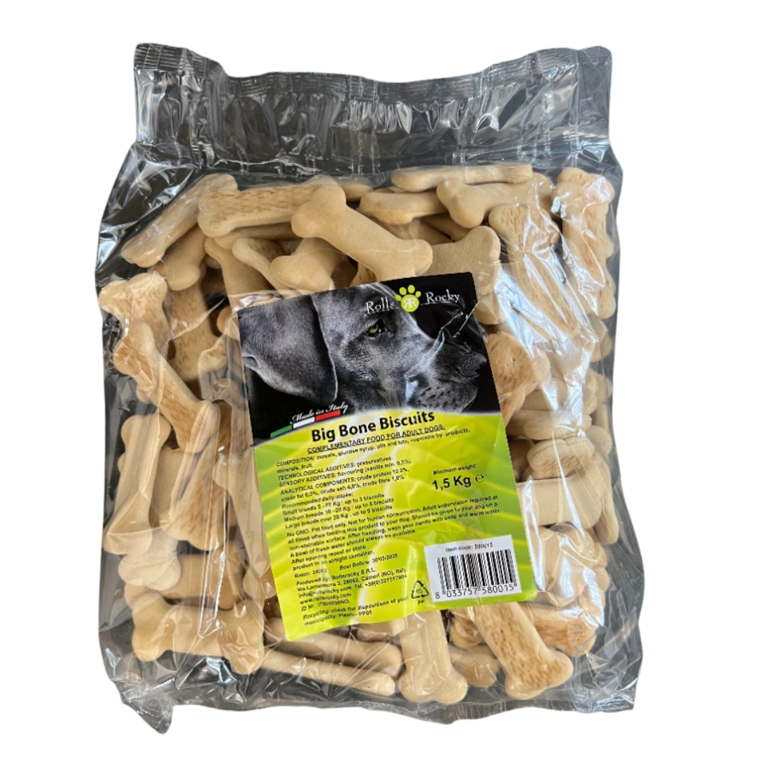 Reward your furry friend with Big Bones Biscuits! These 1.5kg packs of large, bone-shaped dog biscuits are perfect for training and treats.