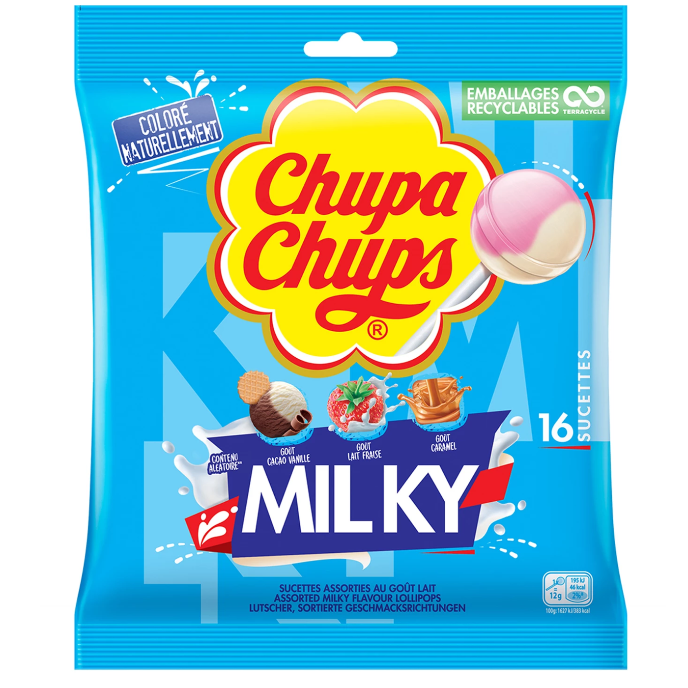 Indulge in creamy sweetness with Chupa Chups Milky Lollipops, featuring rich, smooth flavours like Strawberry & Cream, Vanilla, and Choco. These iconic lollies combine classic candy with a milky twist, creating a soft, indulgent taste loved by all ages. Individually wrapped for freshness, they're perfect for party bags, treats, gifts, or on-the-go snacking.