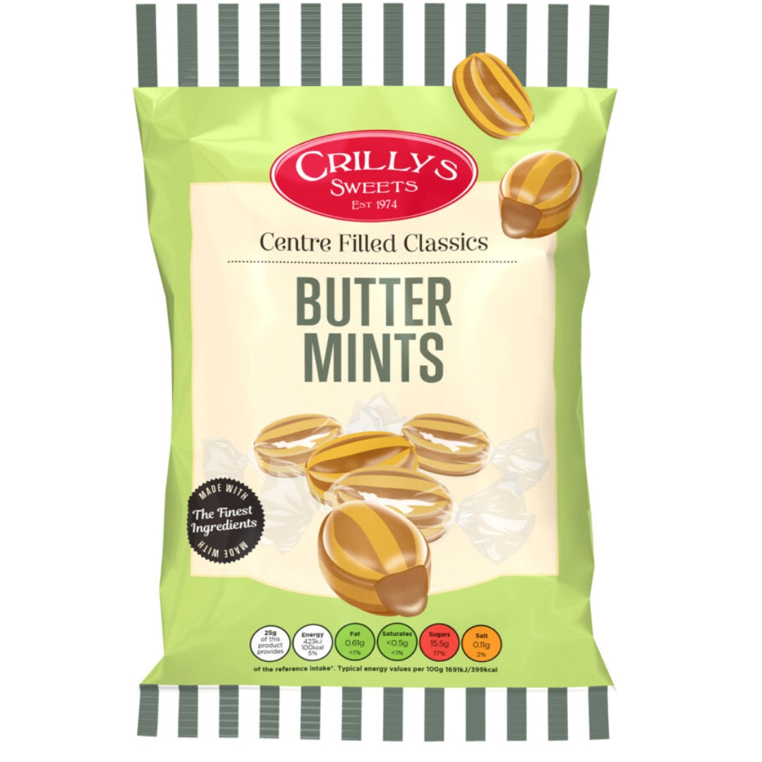 Indulge in Crilly’s Buttermints 100g, a delightful treat that combines smooth, creamy butter with refreshing mint. These soft, melt-in-your-mouth mints are perfect for a sweet treat anytime. Enjoy the perfect balance of rich flavor and minty freshness in every bite. Ideal for gifting or as a personal indulgence.