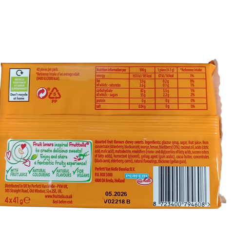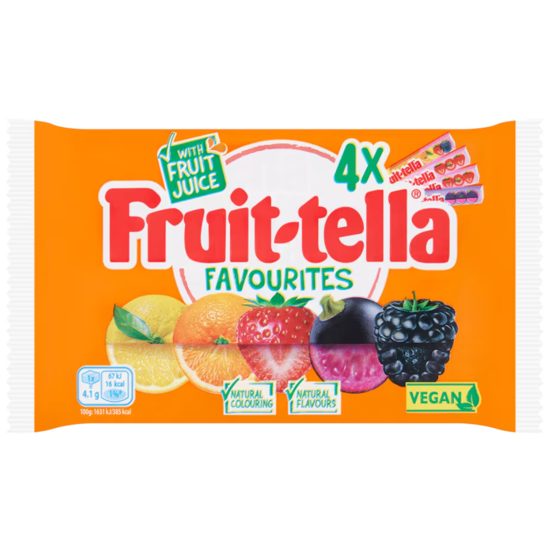 Indulge in the fruity goodness of Fruitella Chewy Fruit Mix 4x41g. This pack contains four individual 41g pouches filled with deliciously chewy fruit-flavored candies that are bursting with natural flavors. Made with real fruit juice, each piece offers a soft, chewy texture and vibrant fruit taste, making it the perfect snack for any fruit lover. Whether you're sharing with friends or enjoying a treat on your own, Fruitella is the sweet way to satisfy your cravings.