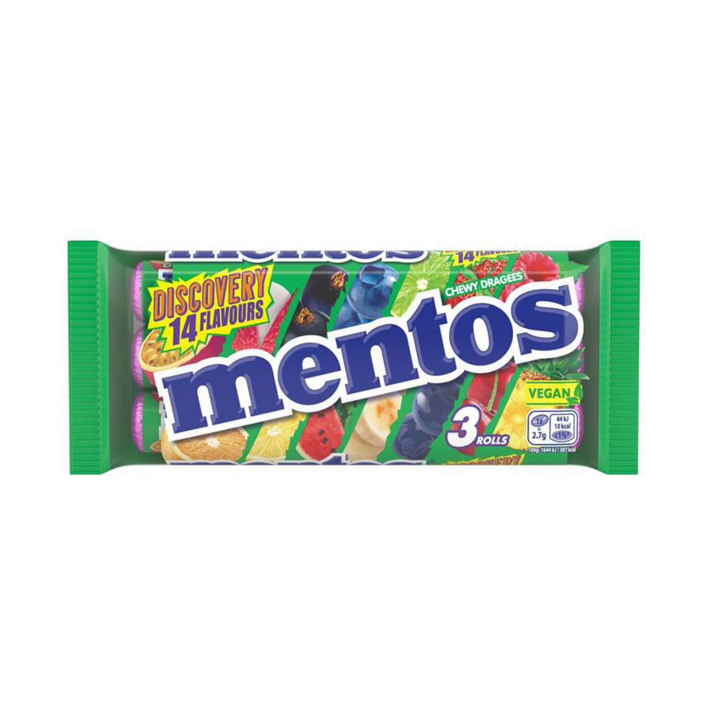 BBE: 02/2028 Embark on a flavourful adventure with the Mentos Discovery 3-Pack! Each 38 g roll bursts with 14 delicious fruity flavours—from tangy raspberry to sweet lychee—in a convenient on-the-go format. Suitable for vegans, vegetarians, and those with nut allergies, this chewy delight is perfect for sharing, snacking, or keeping fresh anywhere you go. A tasty way to explore something new every chew!