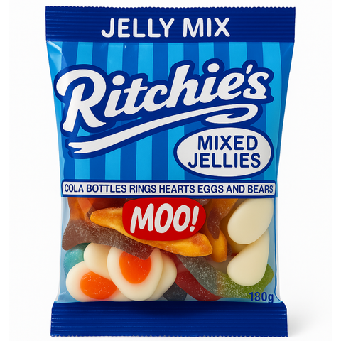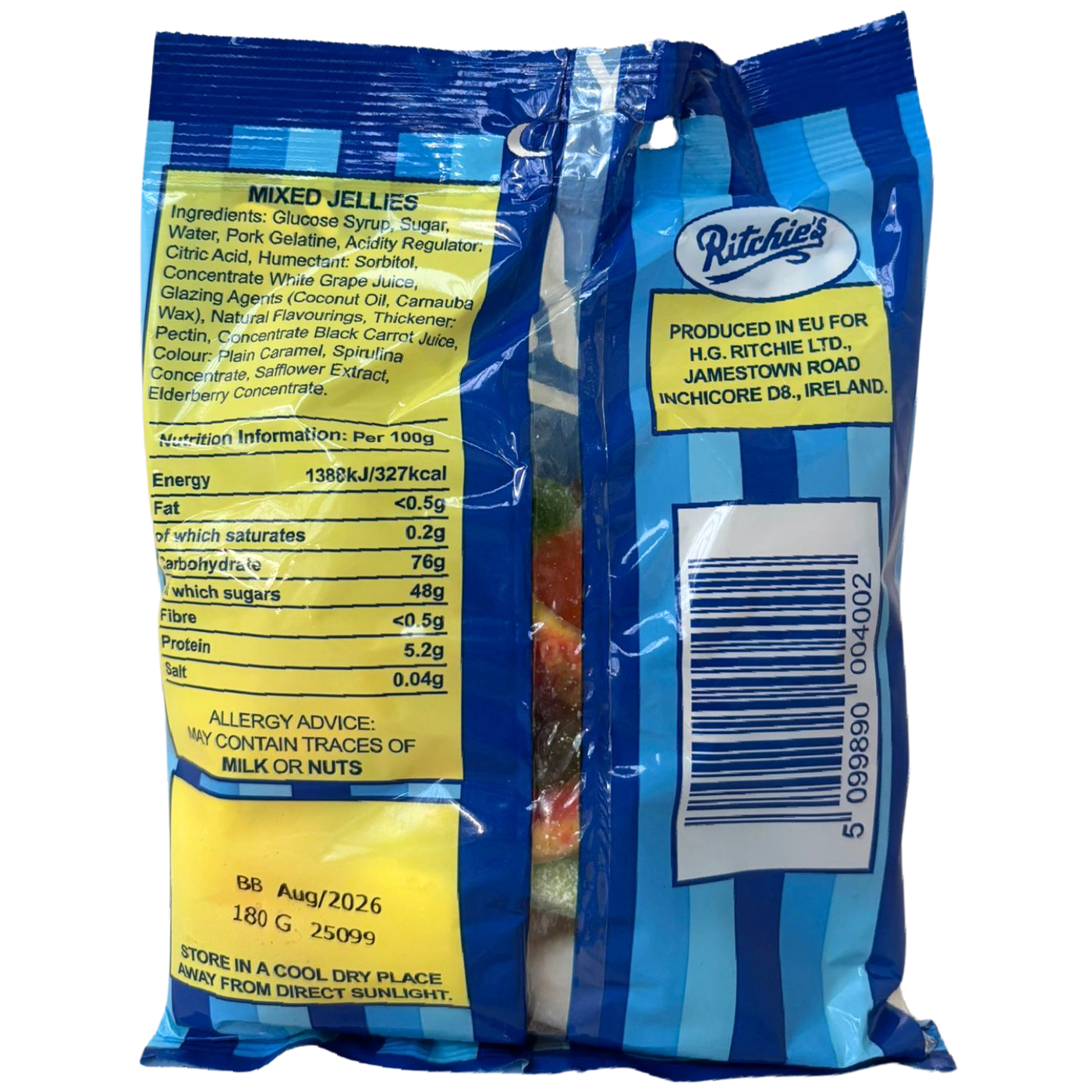 Enjoy a colourful assortment of chewy treats with Ritchies Mixed Jellies 180g. Packed with a variety of fruity flavours and fun shapes, these jelly sweets are perfect for sharing, party bags, or satisfying your sweet tooth. With a soft, chewy texture and classic sweetshop taste, this mix delivers a nostalgic treat for all ages.