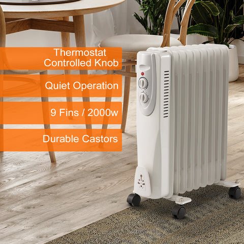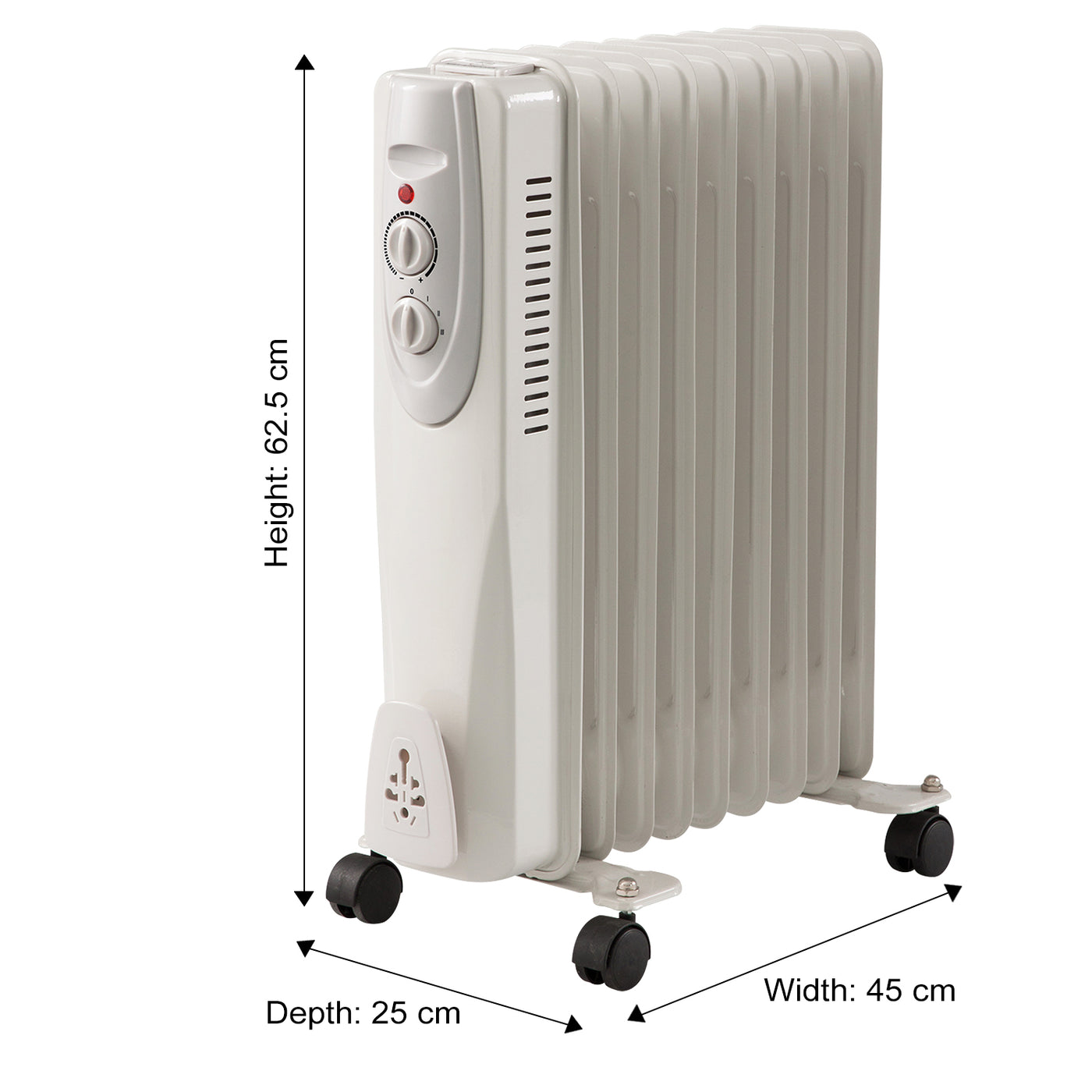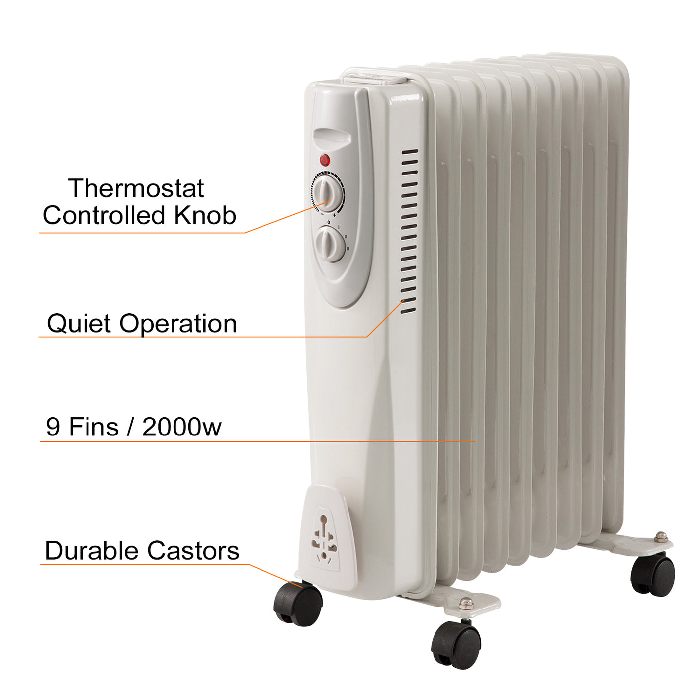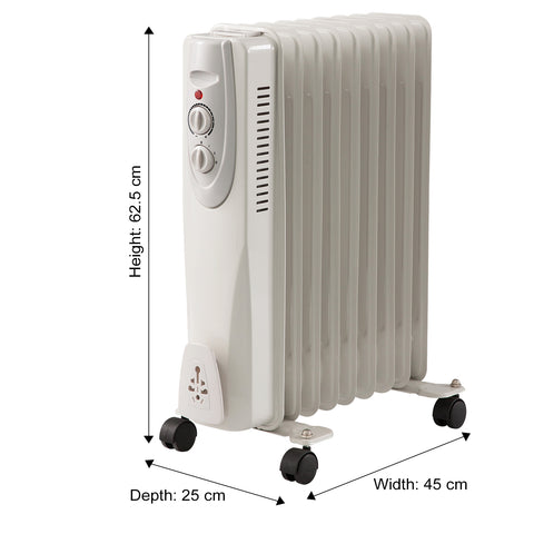 Keep your room warm and comfortable with the 9-Fin Oil Filled Radiator 2kW (White). Offering powerful and efficient heating, this radiator is ideal for bedrooms, offices, and medium-sized living spaces. With multiple heat settings and an adjustable thermostat, you can easily tailor the warmth to your preference. The clean white finish suits any décor, while essential safety features provide peace of mind during use. Quiet, reliable, and easy to manoeuvre — a practical heating solution for colder seasons.