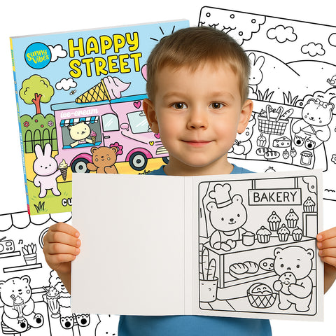 "The Sunny Days Happy Street Colour Book is filled with vibrant, joyful scenes designed to inspire creativity in children. Featuring friendly characters, happy neighbourhoods, and playful outdoor settings, this colouring book is perfect for sparking imagination and providing hours of screen-free fun. Ideal for kids aged 3 and up."