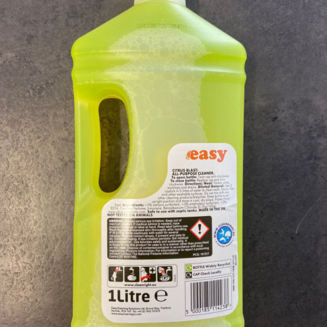 Easy All-Purpose Cleaner Citrus Lemon 1L provides versatile and effective cleaning with a refreshing lemon scent. Ideal for tackling a wide range of surfaces, this powerful cleaner removes grime, stains, and dirt, leaving your home spotless. The invigorating citrus lemon fragrance adds a fresh, uplifting aroma to your space, enhancing your cleaning routine. Perfect for kitchens, bathrooms, and more, Easy All-Purpose Cleaner ensures thorough cleaning performance and a pleasant, clean scent with every use.