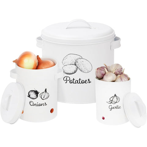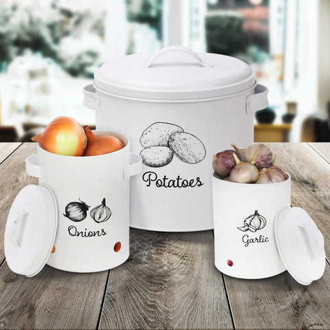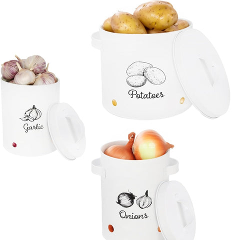 Keep your kitchen organised in style with the White Canister Set of 3 – Garlic, Onions & Potatoes. These storage canisters are designed to help keep produce fresher for longer, with ventilation holes to allow airflow and reduce moisture. Each container is clearly labelled and finished in a clean, modern white tone, making them both practical and decorative on any countertop. A tidy and attractive way to store everyday essentials.