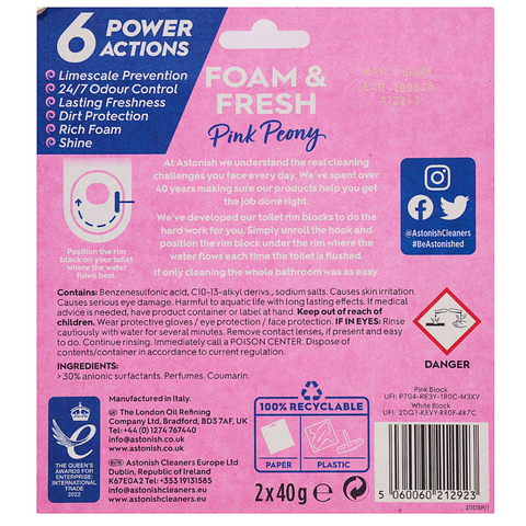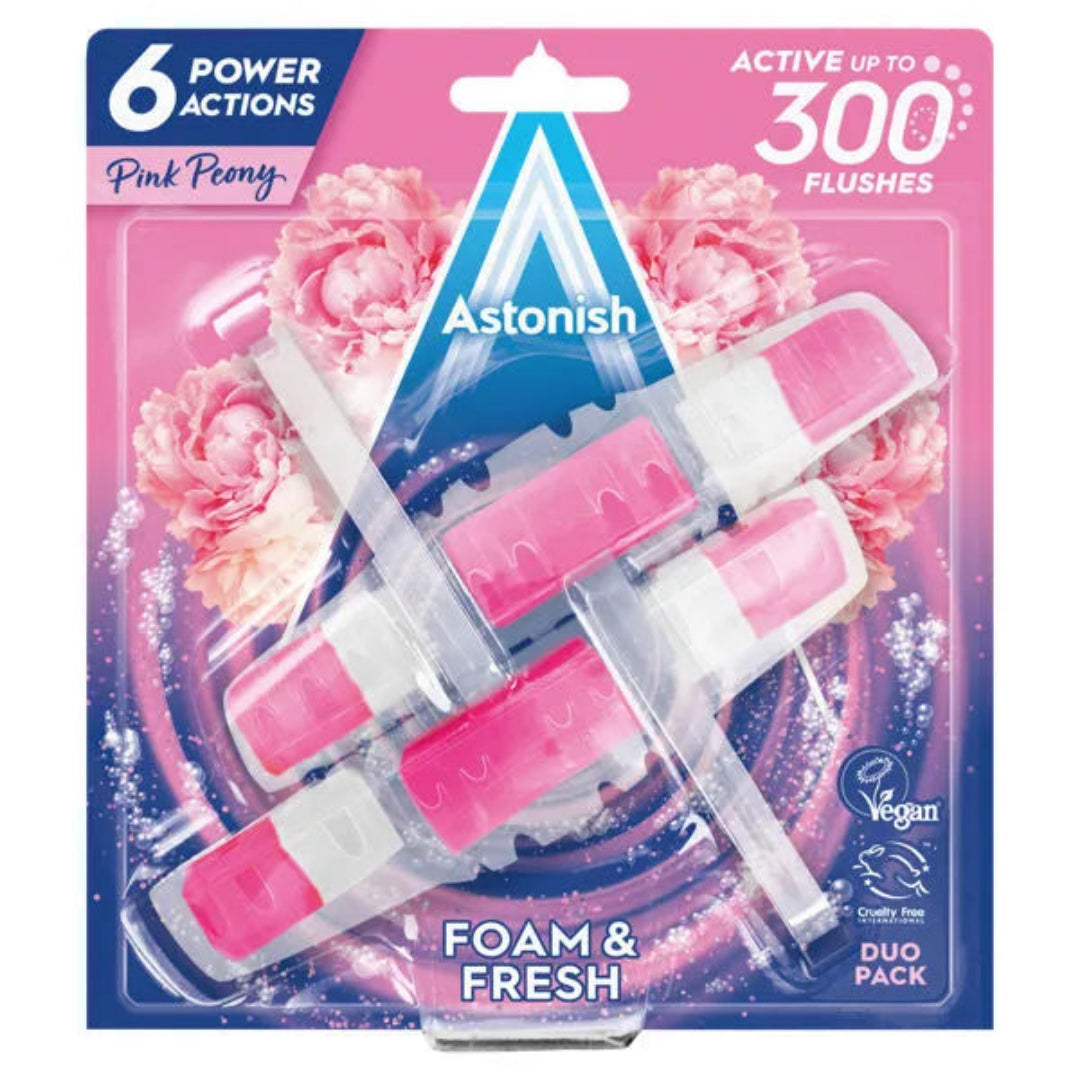 Elevate your cleaning routine with Astonish Foam & Fresh in Pink Peony. This 2x40g pack delivers a luxurious foam cleaner infused with the delightful fragrance of pink peony, transforming your cleaning experience. The foaming action effectively lifts and removes dirt, grime, and stains from various surfaces, leaving them spotless and beautifully scented. Perfect for use in kitchens, bathrooms, and other areas, Astonish Foam & Fresh provides both powerful cleaning and a refreshing burst of peony fragrance. Enjoy a cleaner home with a touch of elegance and a lasting, pleasant aroma.