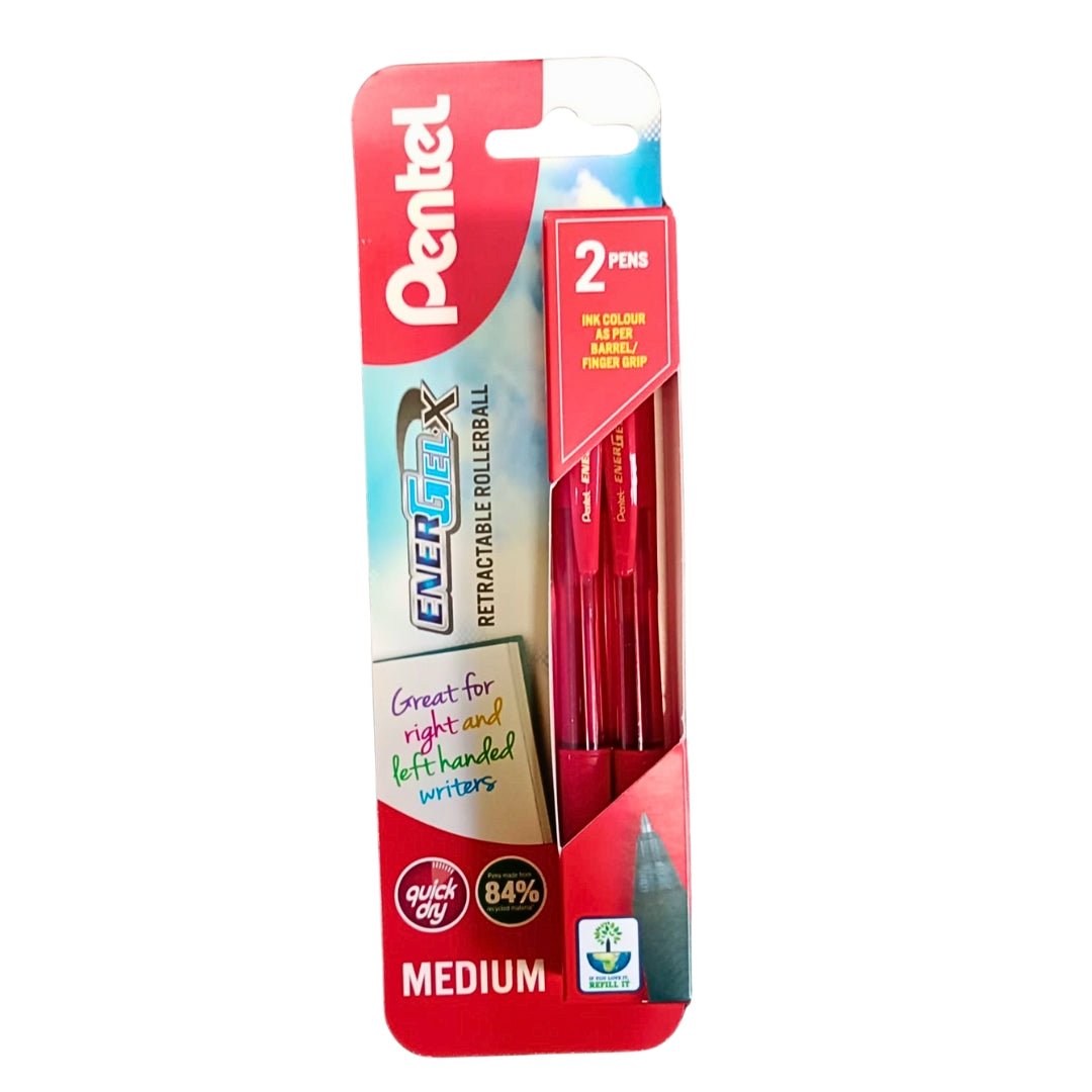 Write with precision using the Pentel EnerGel X Red Pens – 2 Pack. Featuring vivid red, quick-dry gel ink and a sleek retractable design, these pens are ideal for smooth, smudge-free writing. Perfect for marking, editing, or everyday notes, the soft rubber grip ensures all-day comfort. Packaged carded for convenience at school, work, or home.