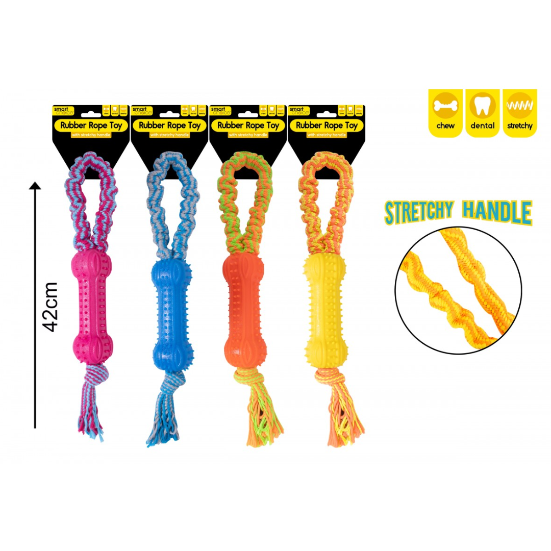 Enhance playtime with our Stretchy Rope & Rubber Tug Dog Toy, designed for durable and interactive fun. This versatile toy combines a strong, stretchy rope with a resilient rubber component, perfect for tugging, chewing, and fetching. The stretchy rope provides flexibility and durability, while the rubber section helps clean teeth and gums during play. Ideal for interactive games and training, this toy keeps your dog engaged and active. Made from high-quality, pet-safe materials, it’s suitable for dogs of all sizes and ensures long-lasting enjoyment