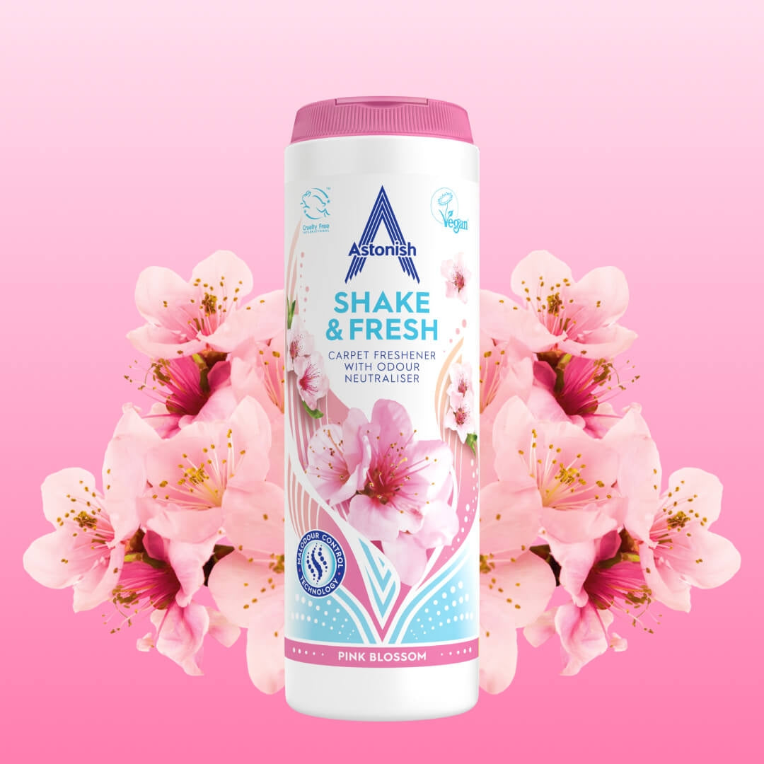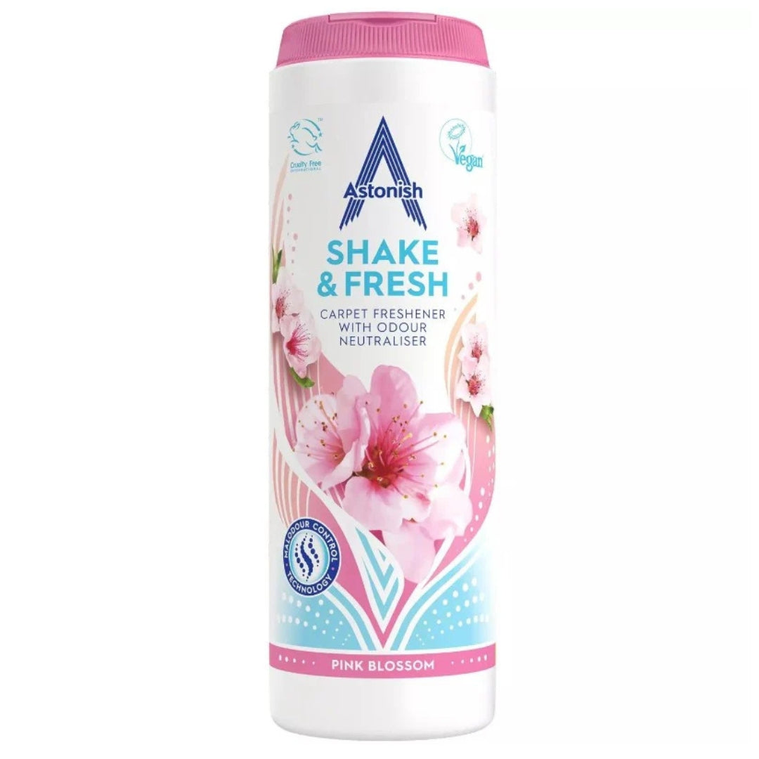 Revitalize your carpets with Astonish Shake & Fresh in Pink Blossom. This 400g carpet freshener eliminates odours and leaves a long-lasting floral fragrance, perfect for keeping your home smelling fresh and clean. Ideal for all carpeted areas.