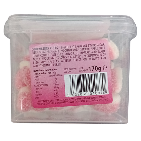 Enjoy the irresistible taste of Strawberry Puffs! These soft, fluffy, and chewy strawberry-flavored sweets come in a 170g resealable tub, perfect for sharing or snacking on the go. Bursting with fruity flavor, they are a delightful treat for candy lovers of all ages. Great for parties, movie nights, or satisfying your sweet cravings anytime.