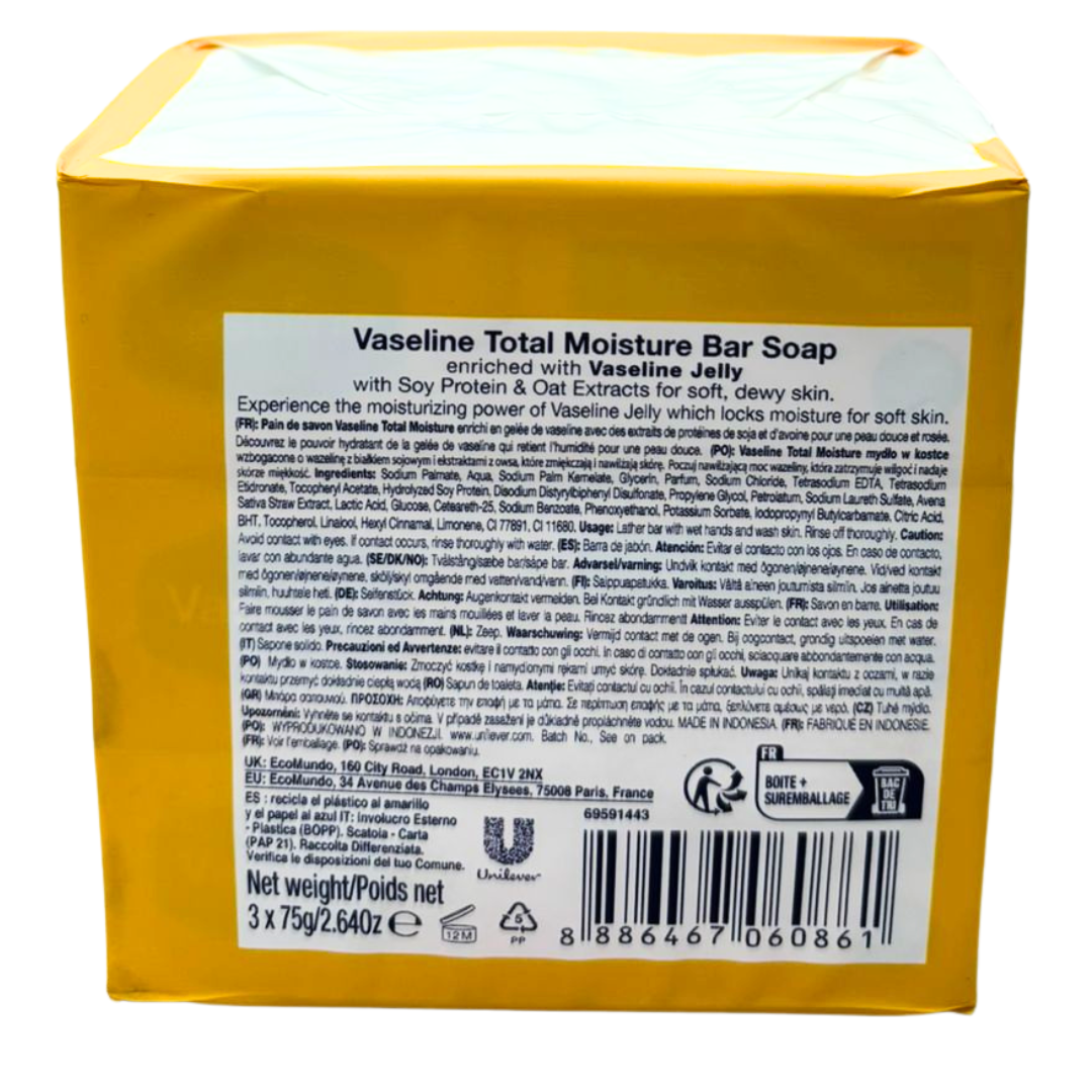 Experience deep hydration and gentle cleansing with Vaseline Total Moisture Soap. Enriched with pure Vaseline jelly and nourishing ingredients, this triple-pack of 75 g bars leaves skin soft, smooth, and refreshed after every wash. Designed to lock in moisture while removing dirt and impurities, it’s ideal for daily use on all skin types — perfect for the whole family.