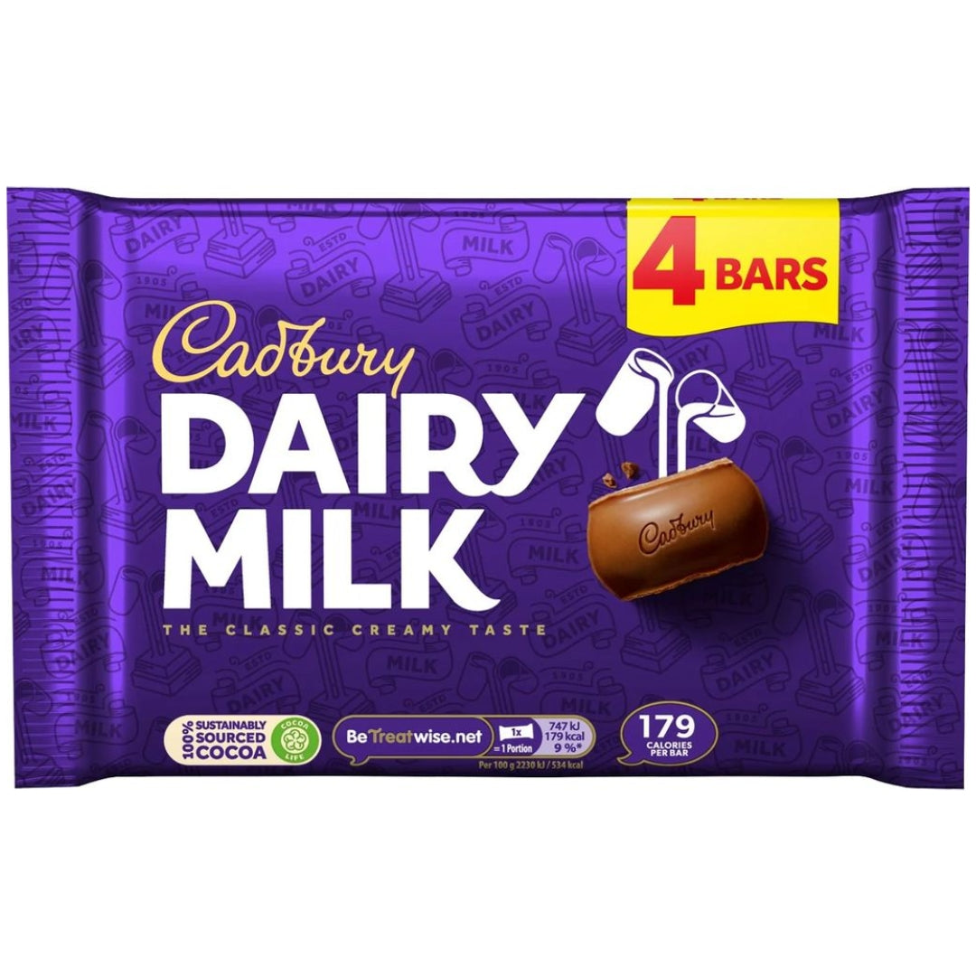 Indulge in the smooth, creamy taste of Cadbury Dairy Milk with this handy 4-pck of 33.5g bars. Made with the finest quality milk chocolate and sustainably sourced cocoa, these individually wrapped bars are perfect for sharing, lunchboxes, or a sweet personal treat.