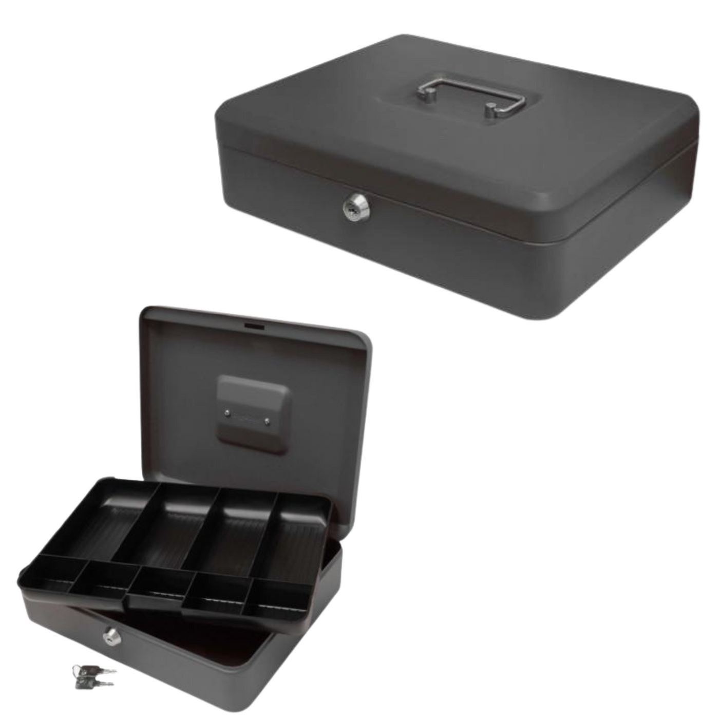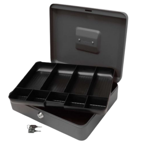 Keep your cash and valuables safe with the 12" Black Cash Box. Featuring a durable metal design, secure key lock, and removable tray for coins and notes, this cash box is perfect for businesses, events, fundraisers, or home use. Strong, reliable, and easy to carry.