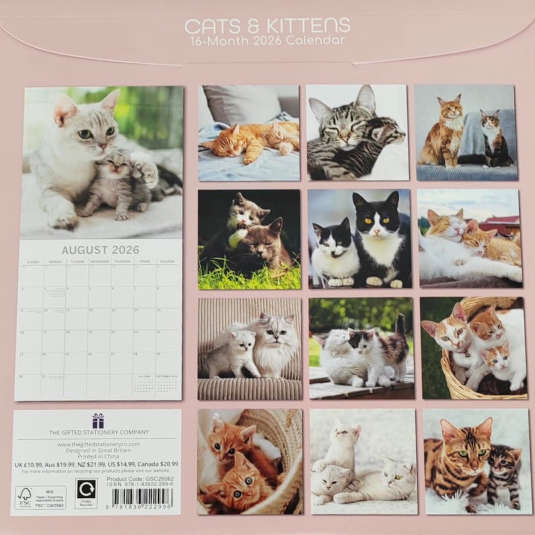 Celebrate your love for cats all year with the 2026 Cats & Kittens Calendar. Featuring adorable photography of playful kittens and majestic cats, this wall calendar is perfect for feline fans of all ages. With a clear monthly layout for notes, appointments, and reminders, it brings both charm and organization to your home, office, or makes a purr-fect gift.