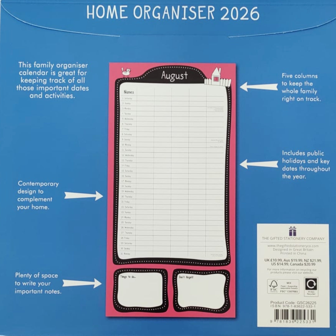 Stay organised in 2026 with this Home Family Organiser Calendar. Featuring spacious monthly layouts with room for notes and schedules, it’s designed to help busy households manage activities, appointments, and events with ease. Perfect for family planning and home organisation.