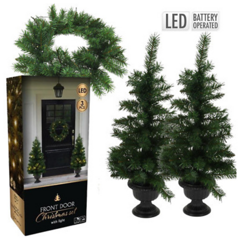Set includes 2 mini pre-lit Christmas trees and 1 coordinating wreath or garland.