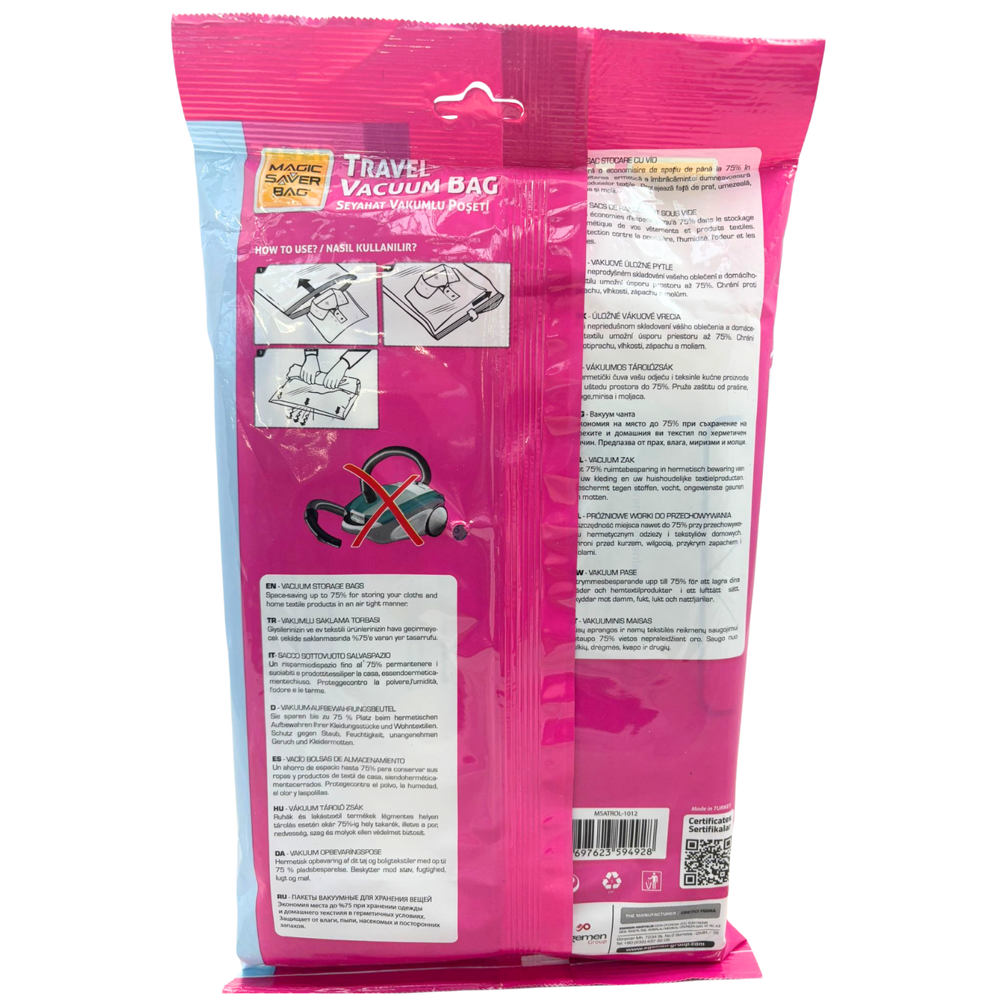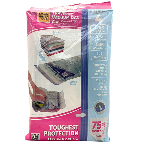 Maximise your packing space with this 4-Pack of Travel Vacuum Storage Bags, featuring assorted sizes perfect for clothing, bedding, and accessories. Designed to compress and protect your items, these bags reduce bulk by up to 75%, making them ideal for travel, moving, or seasonal storage.