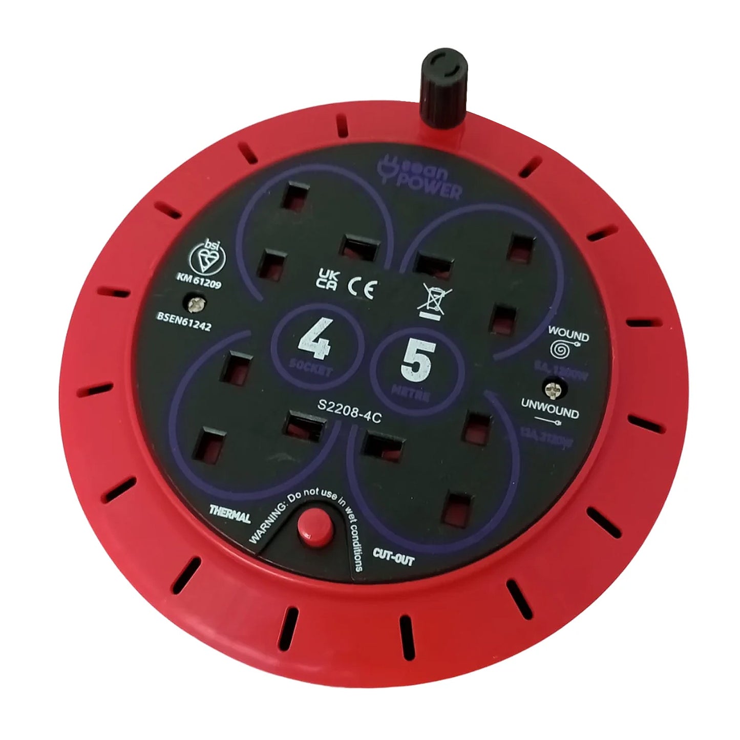 🔌 Key Features• 4 x UK 13A plug sockets• High load capacity – ideal for power tools & household use• Built-in thermal cut-out for safety• Compact cassette design for space-saving storage• Easy-reel mechanism keeps cable neat• Durable carry handle for portability