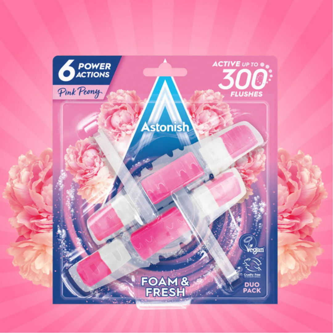Elevate your cleaning routine with Astonish Foam & Fresh in Pink Peony. This 2x40g pack delivers a luxurious foam cleaner infused with the delightful fragrance of pink peony, transforming your cleaning experience. The foaming action effectively lifts and removes dirt, grime, and stains from various surfaces, leaving them spotless and beautifully scented. Perfect for use in kitchens, bathrooms, and other areas, Astonish Foam & Fresh provides both powerful cleaning and a refreshing burst of peony fragrance. Enjoy a cleaner home with a touch of elegance and a lasting, pleasant aroma.