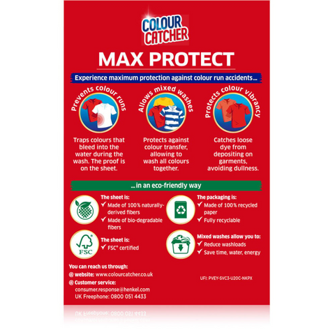 Keep your clothes safe from unwanted colour stains with Colour Catcher Max. Each sheet is designed to absorb and trap loose dyes during the wash, preventing colour transfer between garments. Ideal for mixed laundry loads, these sheets help protect your clothes from fading or staining, ensuring vibrant colours stay true. With 40 sheets in a pack, you can enjoy hassle-free washing and keep your clothes looking their best for longer.
