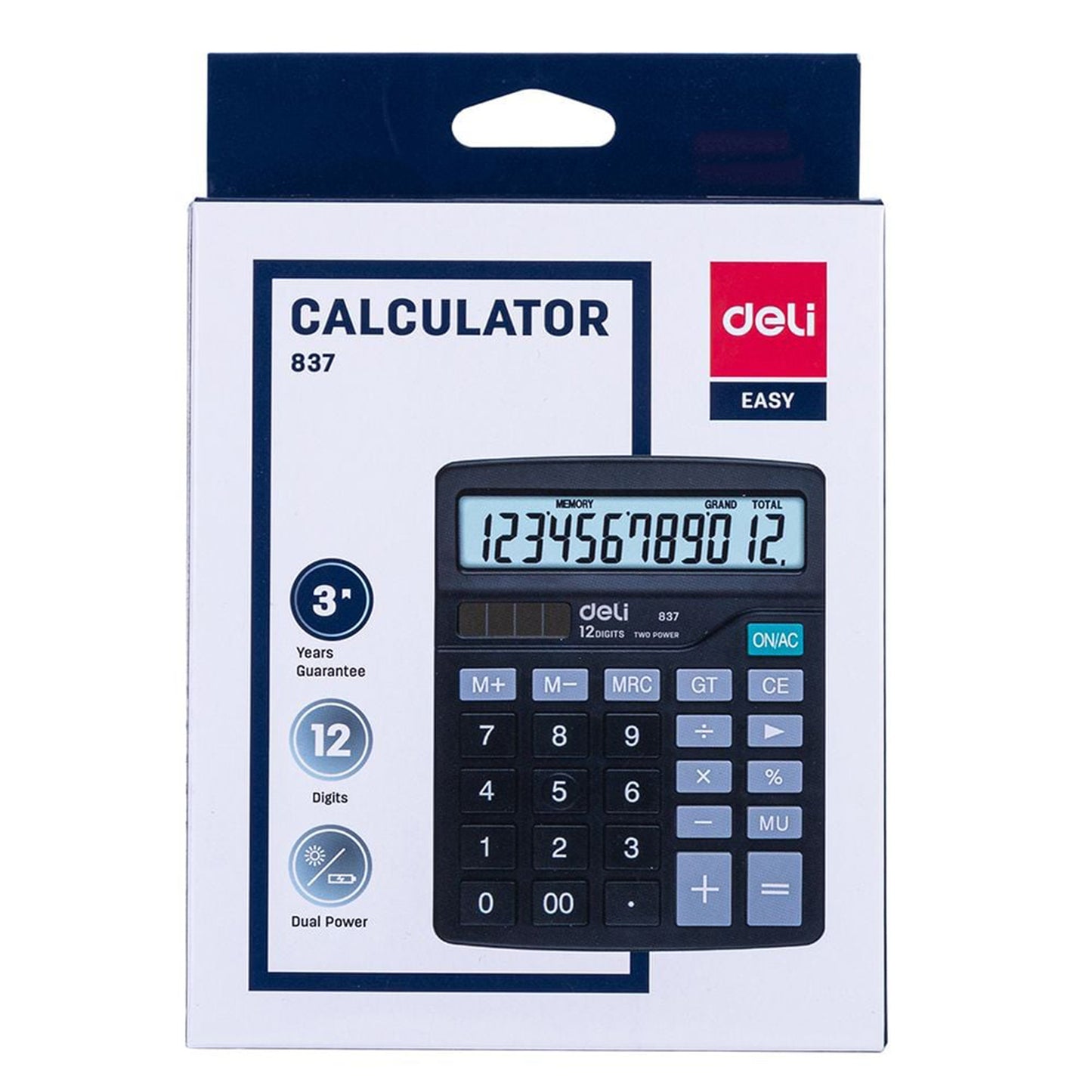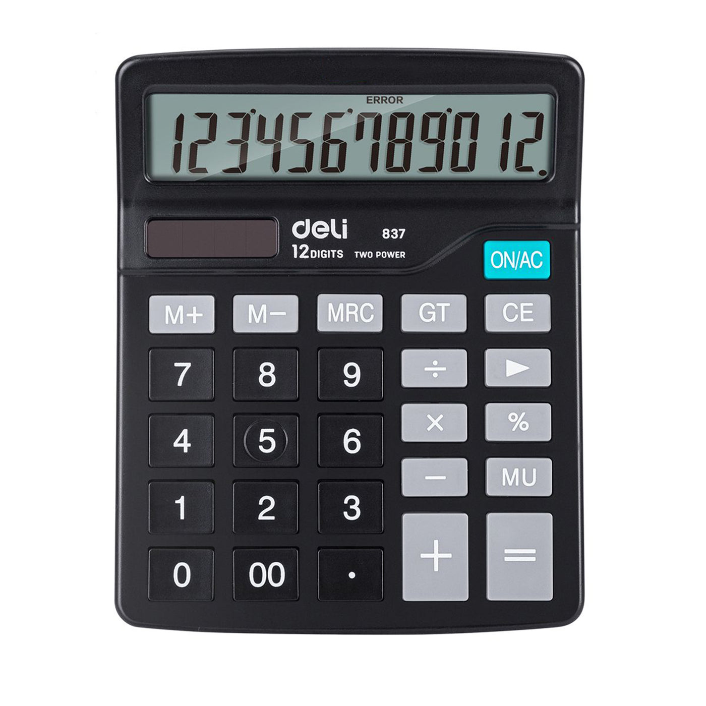 Deli Calculator – A reliable 12-digit desktop calculator featuring large, easy-to-read LCD, dual power (solar + AA battery), and oversized, responsive keys. It handles all basic arithmetic, percentages, memory functions, total, backspace, and auto power-off—ideal for office, school, and home use