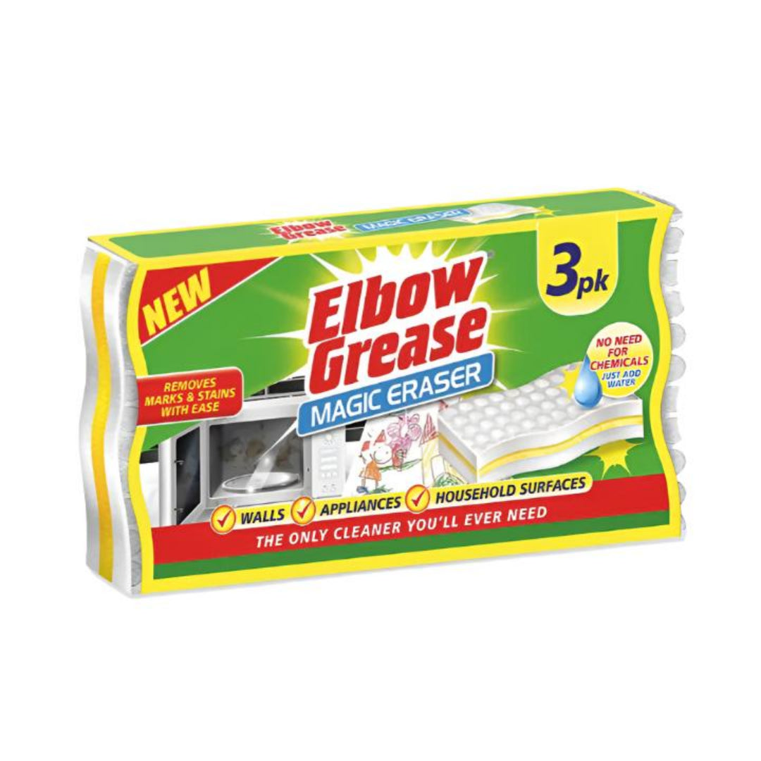 Tackle stubborn stains effortlessly with Elbow Grease Sponge Erasers. This 3-pack is designed for powerful, chemical-free cleaning on a variety of surfaces, making it ideal for removing grime, scuffs, and tough marks. Perfect for quick and effective household cleaning.