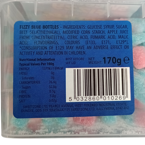 Treat yourself to the tangy and delicious taste of Fizzy Blue Bottles in a 170g tub! These blue raspberry-flavored chewy sweets are coated in a fizzy sugar layer, delivering the perfect mix of sweetness and sourness in every bite. Ideal for snacking, sharing, or party treats, these fizzy blue bottles are a favorite among candy lovers. Perfect for movie nights, road trips, or satisfying your sweet tooth anytime!