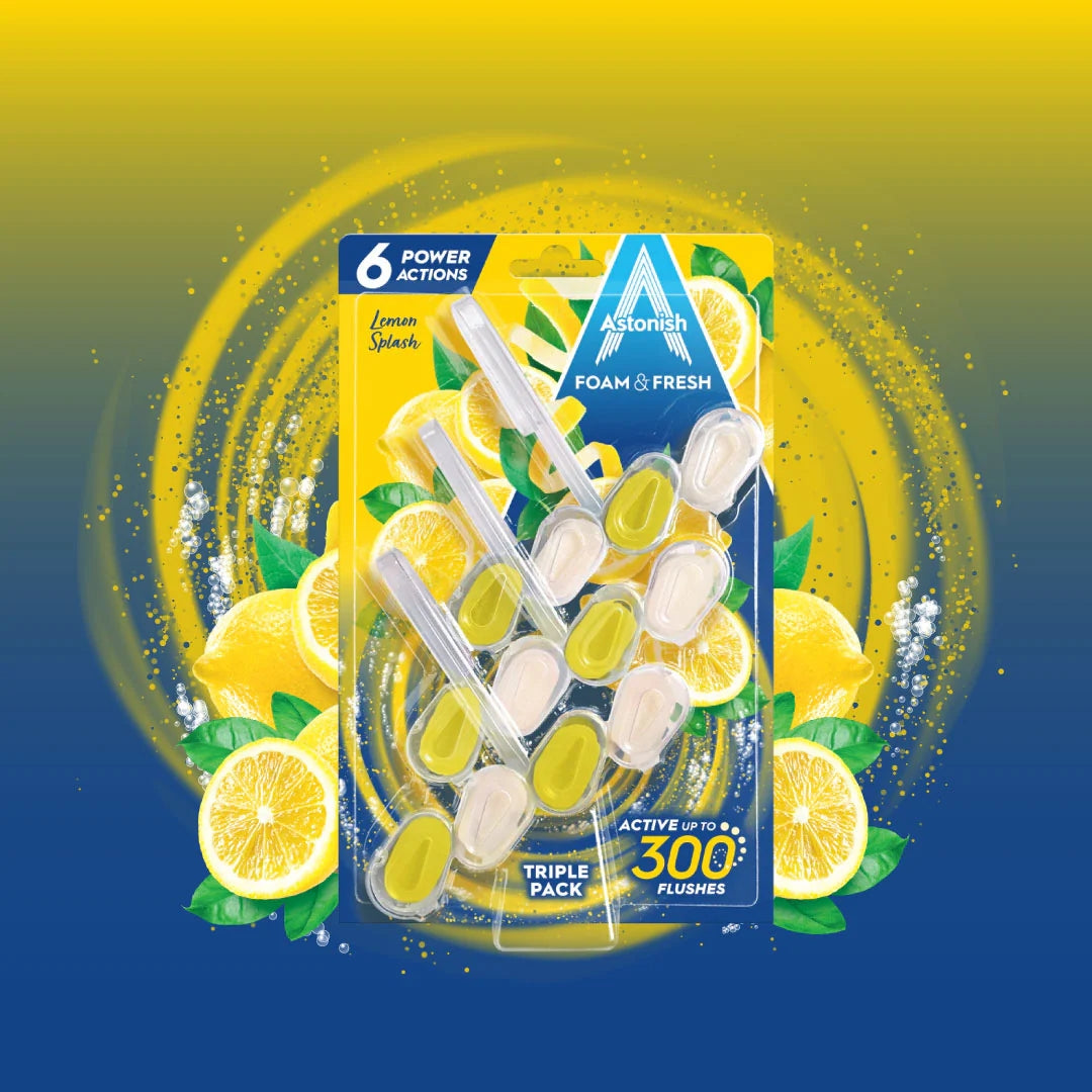 Keep your bathroom smelling fresh and looking clean with the Foam & Fresh Lemon Splash 3 pack. This triple pack delivers a powerful foaming action that freshens your toilet bowl with every flush, while the vibrant lemon scent leaves a crisp, citrus fragrance behind. Easy to use and long-lasting, it’s the perfect way to maintain a hygienic, pleasantly scented bathroom between deep cleans.