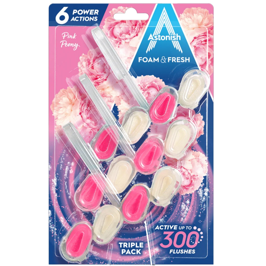 Keep your bathroom beautifully fresh with the Foam & Fresh Pink Peony 3-Pack. Each rim block releases a gentle pink peony fragrance with every flush, while the foaming action helps clean the bowl, fight limescale, and prevent stains — so your toilet stays sparkling clean and fresh day after day.