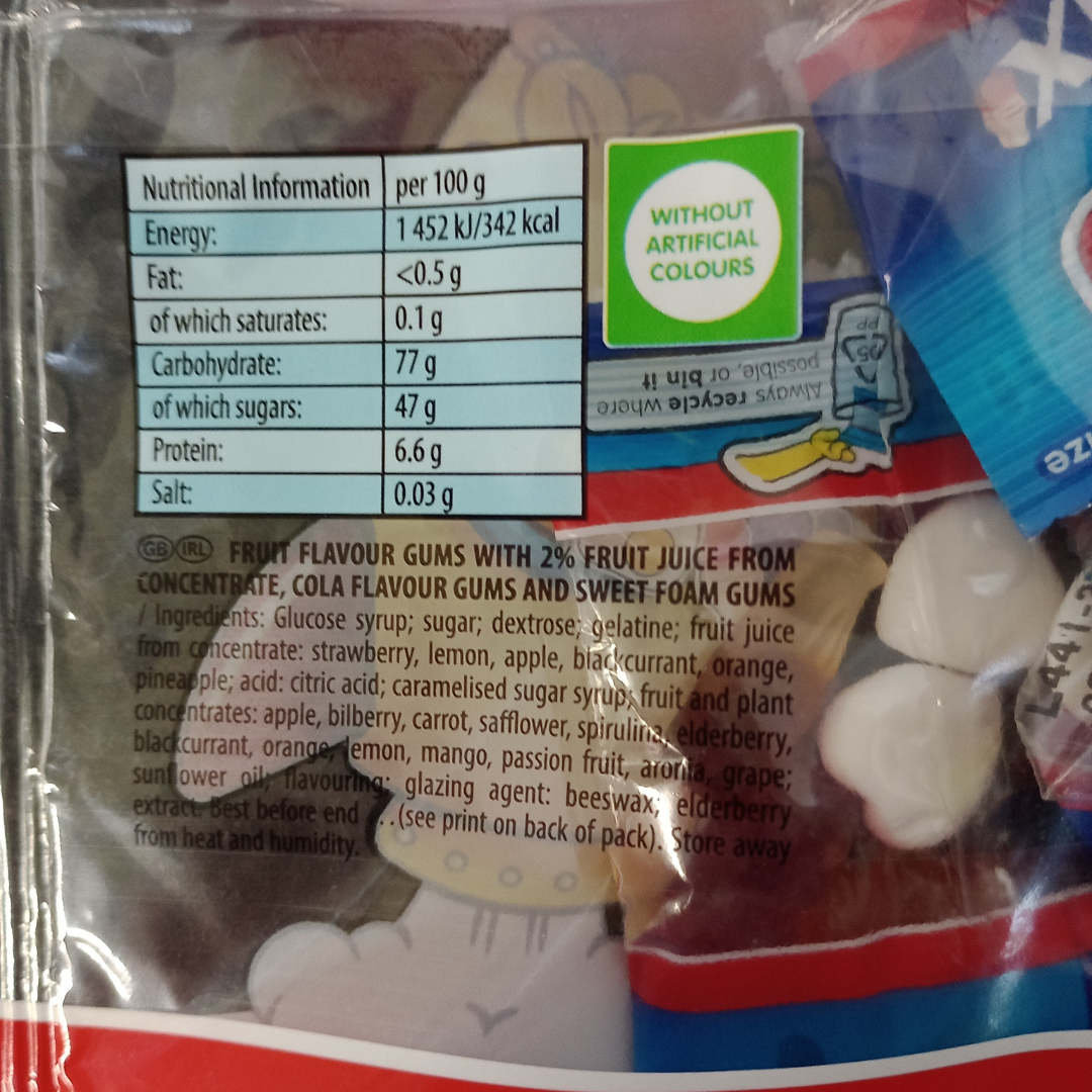 Glucose Syrup, Sugar, Dextrose, Gelatine, Fruit Juice from Concentrate: Strawberry, Lemon, Apple, Blackcurrant, Orange, Pineapple, Acid: Citric Acid, Flavouring, Fruit and Plant Concentrates: Apple, Bilberry, Carrot, Safflower, Spirulina, Elderberry, Blackcurrant, Orange, Lemon, Mango, Passion Fruit, Aronia, Grape, Caramelised Sugar Syrup, Elderberry Extract, Glazing Agents: Beeswax, Carnauba Wax