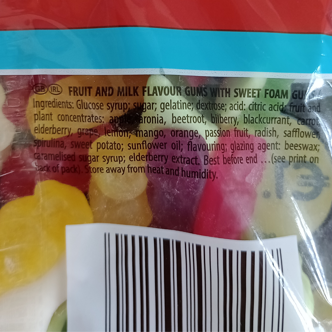 Glucose Syrup, Sugar, Gelatine, Acid: Citric Acid, Flavouring, Fruit and Plant concentrates: Apple, Aronia, Beetroot, Bilberry, Blackcurrant, Carrot, Elderberry, Grape, Lemon, Mango, Orange, Passion Fruit, Radish, Safflower, Spirulina, Sweet Potato, Glazing Agents: Beeswax, Carnauba Wax, Caramelised Sugar Syrup, Elderberry Extract.