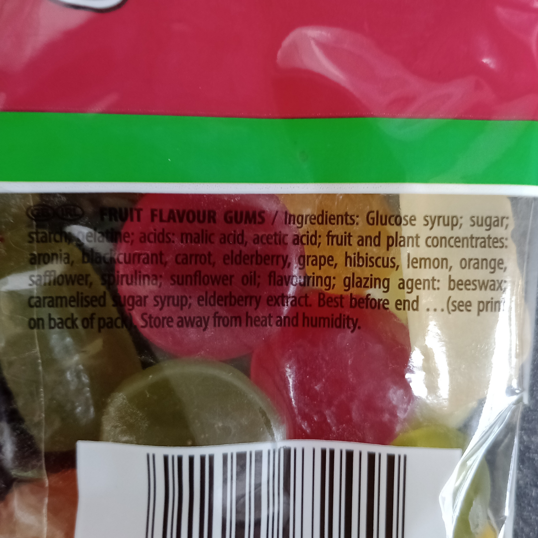 Glucose Syrup, Sugar, Acetic Acid, Starch, Gelatine, Acids: Malic Acid, Acetic Acid, Fruit and Plant Concentrates: Aronia, Blackcurrant, Carrot, Elderberry, Grape, Hibiscus, Lemon, Orange, Safflower, Spirulina, Sunflower Oil, Flavouring, Glazing Agent: Beeswax, Caramelised Sugar Syrup, Elderberry Extract