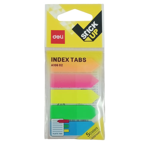Deli Index Tabs are versatile, adhesive-backed tabs designed for easy organization and quick reference. Measuring 43mm ×12mm, each pack contains 5 colors—pink, orange, yellow, green, and blue—with 20 sheets per color, totaling 100 tabs. Made from durable 0.05mm BOPP film, these tabs are writable with most pens and pencils and are repositionable without leaving residue. Ideal for color-coding, marking, and indexing documents in offices, schools, and homes.