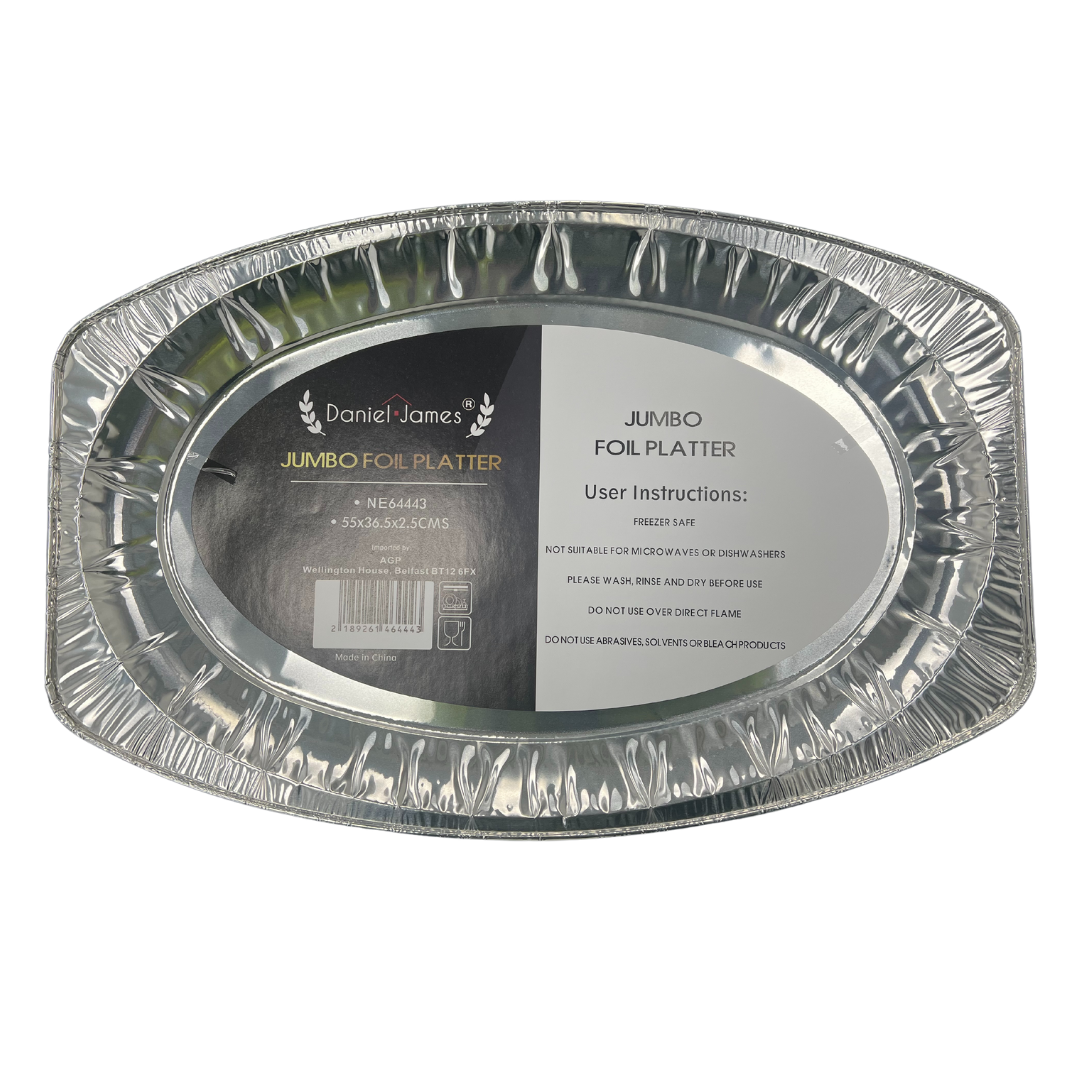 Serve your guests in style with our Jumbo Foil Platter, perfect for large gatherings and events. Weighing 76g, this sturdy disposable serving tray is ideal for holding generous portions of food, from appetizers to main courses. The durable foil construction ensures it holds up well under heavy dishes, making cleanup a breeze. Whether you're hosting a party, catering an event, or preparing for a picnic, this jumbo foil platter is a convenient and practical choice for any occasion.