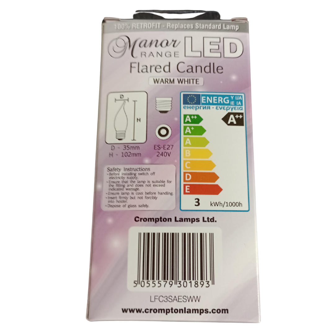 The LED Flared Candle Bulb 3W ES-E27 combines energy efficiency with elegant design, making it an ideal choice for modern and traditional lighting fixtures. With its flared candle shape and warm white glow, this bulb enhances the ambiance of any room, whether used in chandeliers, table lamps, or wall sconces.